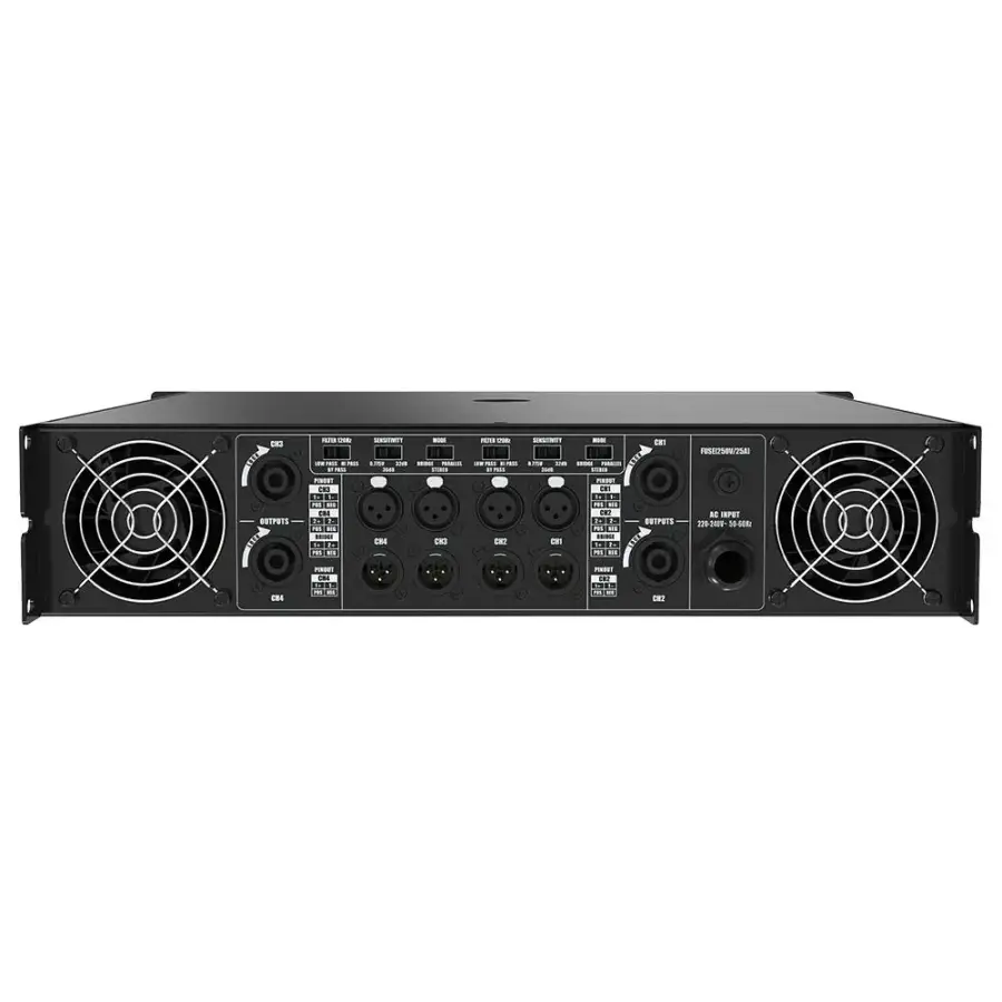 Cihazın giriş bağlantıları erkek ve dişi XLR konnektörleriyle sağlanırken, çıkışlar Speakon 4 pin üzerinden yapılmaktadır. Bu profesyonel bağlantı yapısı sayesinde sistem kurulumu hızlı ve güvenlidir. 2U yüksekliğindeki rack uyumu sayesinde kolay entegre edilebilir. Zorunlu soğutmalı, arkadan öne hava akışı sağlayan fanlı soğutma sistemi, cihazın yoğun çalışma koşullarında bile performansını korumasına yardımcı olur. 483×88×457mm ölçülerindeki gövde ve 27 kg net ağırlığıyla sağlamlık ve taşınabilirlik arasında iyi bir denge sunar.
