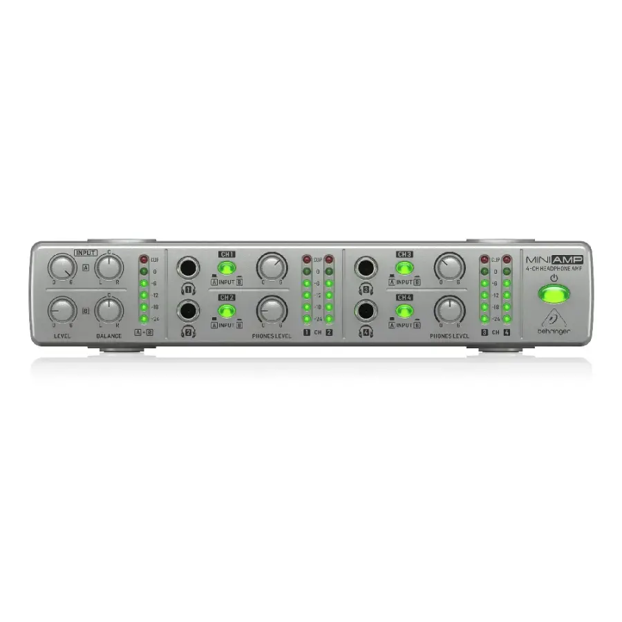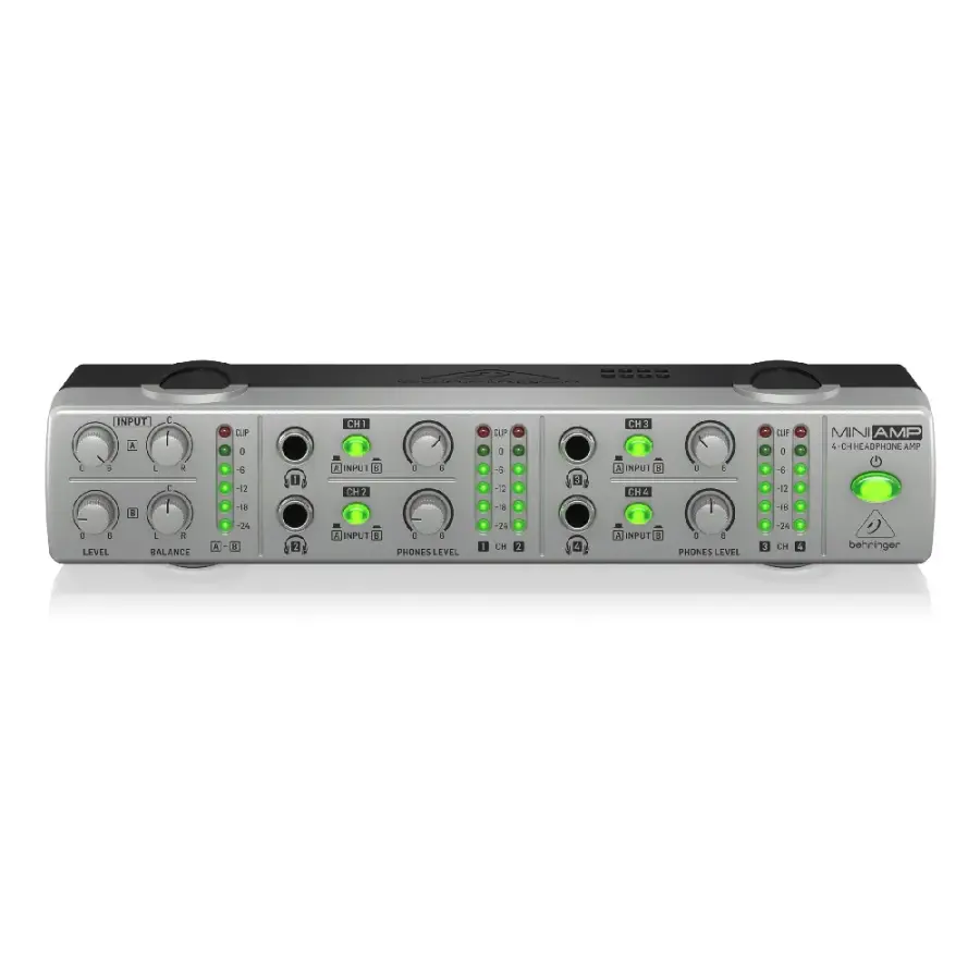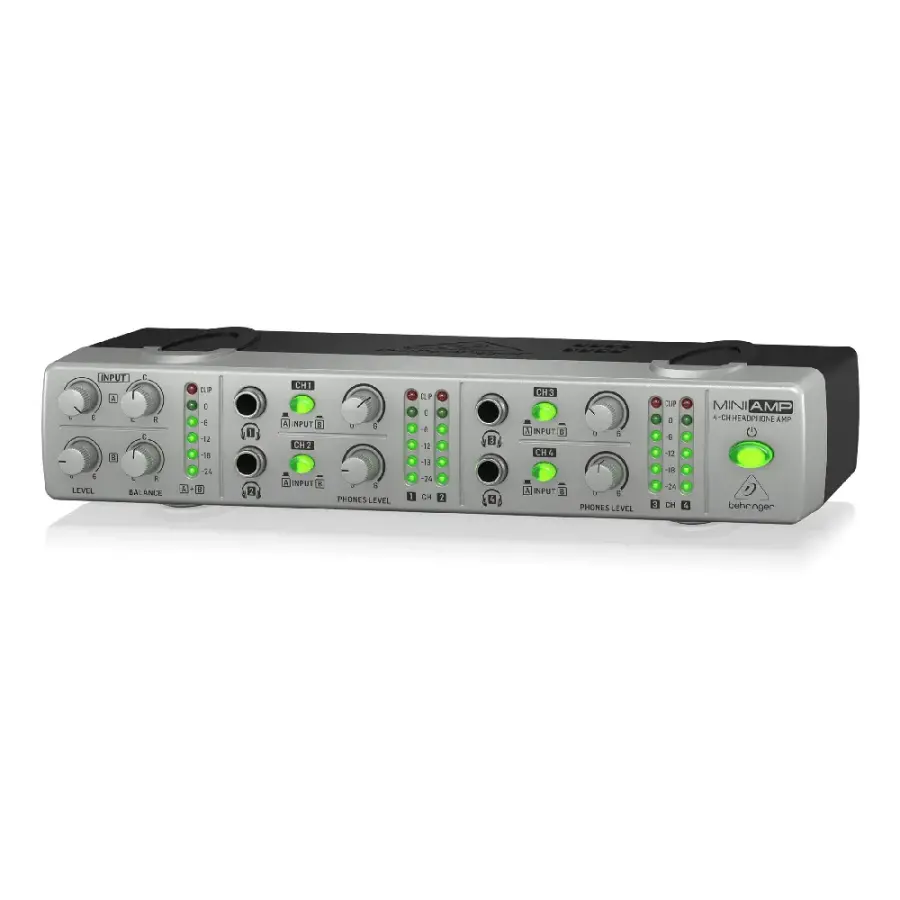 Behringer AMP800 V2, hem stüdyo hem de sahne uygulamaları için tasarlanmış, ultra kompakt yapıda profesyonel bir 4 kanallı stereo kulaklık amfisi sistemidir. Küçük boyutlarına rağmen sunduğu yüksek performans ile sekiz çift kulaklığa kadar güç sağlayabilen bu cihaz, ses sinyalini en yüksek ses seviyelerinde bile bozmadan ileterek kristal netliğinde bir duyum sunar.