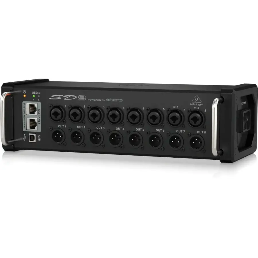 SD8, 8 Midas tasarımlı uzaktan kontrol edilebilir mikrofon ön amplifikatörü, sahne sonunda 8 dengeli analog XLR dönüşü ve ayrıca herhangi bir ek donanım gerektirmeden P16-M kişisel monitör mikserlerimize doğrudan bağlantı için entegre 2 bağlantı noktalı ULTRANET dağıtım merkezi sağlar.