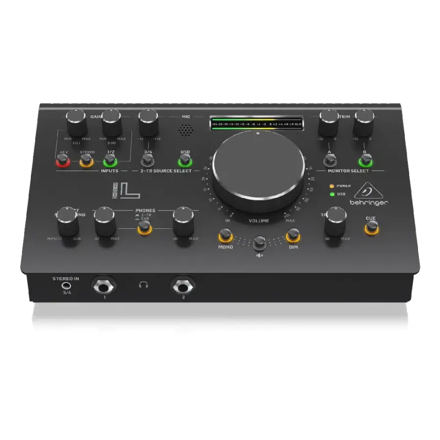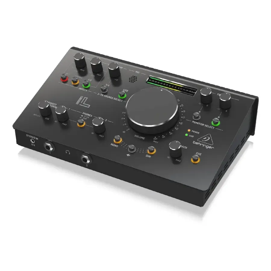 The Behringer Studio L combines effective studio control and communication with a capable 2-in/2-out USB audio interface. This convenient studio solution packs a monitor controller, a source selector, a monitor switcher, and talkback into a streamlined, desktop-friendly unit. The Studio L is centered around a VCA-controlled volume knob, which provides super-precise level control. This multifunction monitor controller accommodates two sets of studio monitors, and it includes four inputs with level controls, plus USB monitoring from your DAW. The talkback section includes an onboard microphone and a level control. You also get handy mono, mute, and dim functions. The Studio L's built-in audio interface operates at up to 192kHz for the best sound possible, and it includes two Midas mic preamps with +48V phantom power. Plus, dual headphone amplifiers make private monitoring a cinch. Zero-latency direct monitoring, a quick-access auxiliary input, and high-precision dual LED meters round out the Studio L's robust feature set.