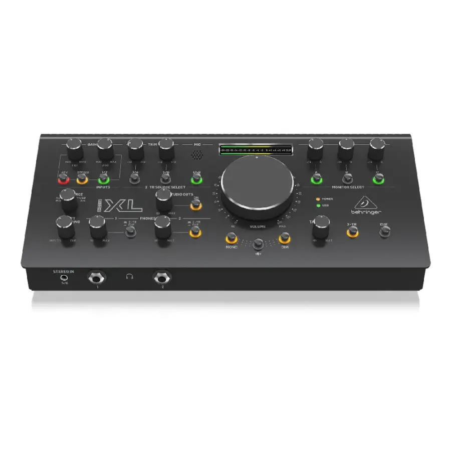 The Behringer Studio XL is much more than a monitor controller — think of it as your ultimate studio command center. This high-quality controller is perfect for not only clear and accurate volume control, but also for source selecting, monitor switching, and easy studio communication. Equipped with two +48V phantom powered Midas microphone preamps and a low-hum, 192kHz 2x4 USB interface, the Studio XL is great for supplying crystal-clear vocals in computer-based studios. The extra-large volume control knob is armed with VCA technology, and it's powered through a separate, volume-specific high-precision amp circuit that provides incredible stereo coherency that won't degrade over time. When it comes to monitoring options, the possibilities are endless. The Studio XL lets you switch between three studio monitors with individual level adjustments so you can test the quality of your recordings from multiple locations, through multiple lenses. You'll also get two line/mic jacks, 2-track and Studio/Phones Amp outputs, and the option to connect a 2-track digital recorder, soundcard, mixer, and more. The Studio XL even features a talkback function via the built-in microphone, allowing you to communicate easily with musicians elsewhere in the studio.
