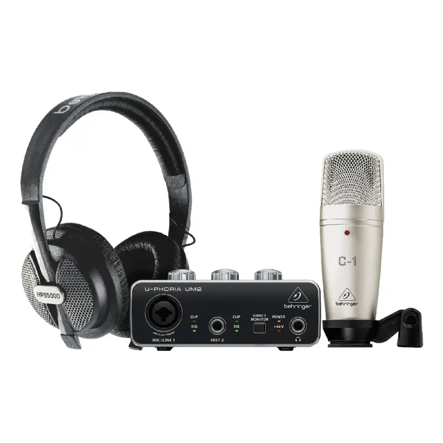 desk, saving space is the name of the game. That's why Behringer included the ultra-compact U-Phoria UM2 USB audio interface in this bundle. It includes one combination TRS/XLR input with a studio-grade XENYX mic preamp and a second TRS instrument input. This interface is capable of recording crystal-clear audio that will wow your listeners.