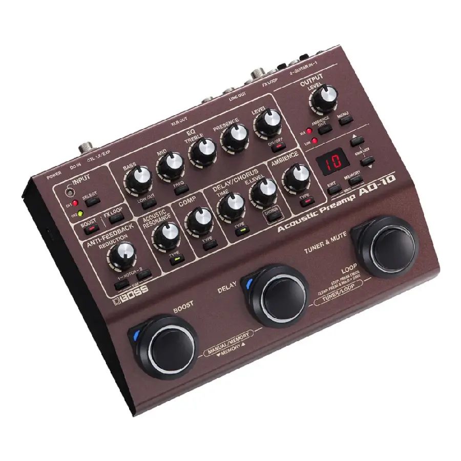 AD-10 üzerinde bulunan 80 saniyelik phrase looper, pratik, beste ve canlı performans sırasında yaratıcı kullanım imkânları sunar. Boost footswitch ve ayarlanabilir boost tonu, solo ve öne çıkması gereken bölümlerde miks içinde netlik sağlar. Dahili tuner ve mute fonksiyonları sahne üzerinde hızlı ve sessiz akort yapmayı mümkün kılar. USB bağlantısı sayesinde AD-10, bilgisayar ortamında doğrudan kayıt için bir USB ses arayüzü olarak da kullanılabilir.