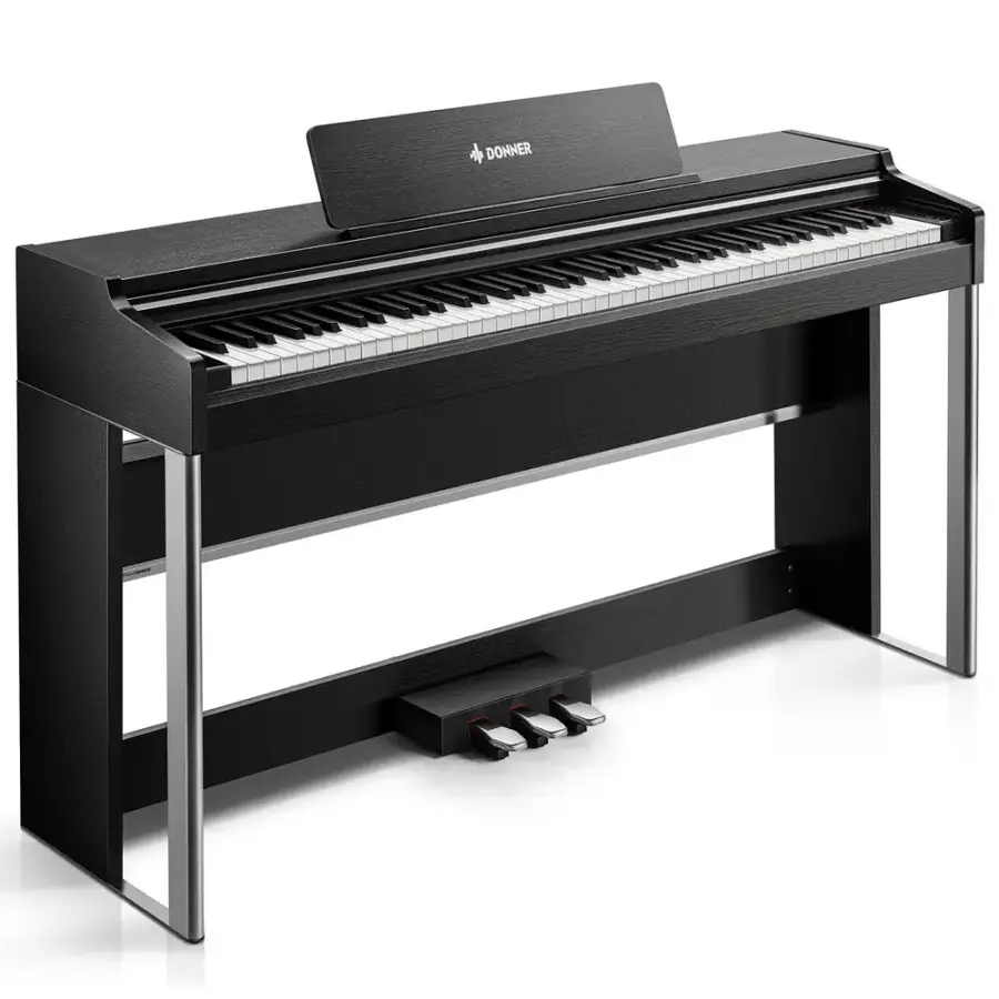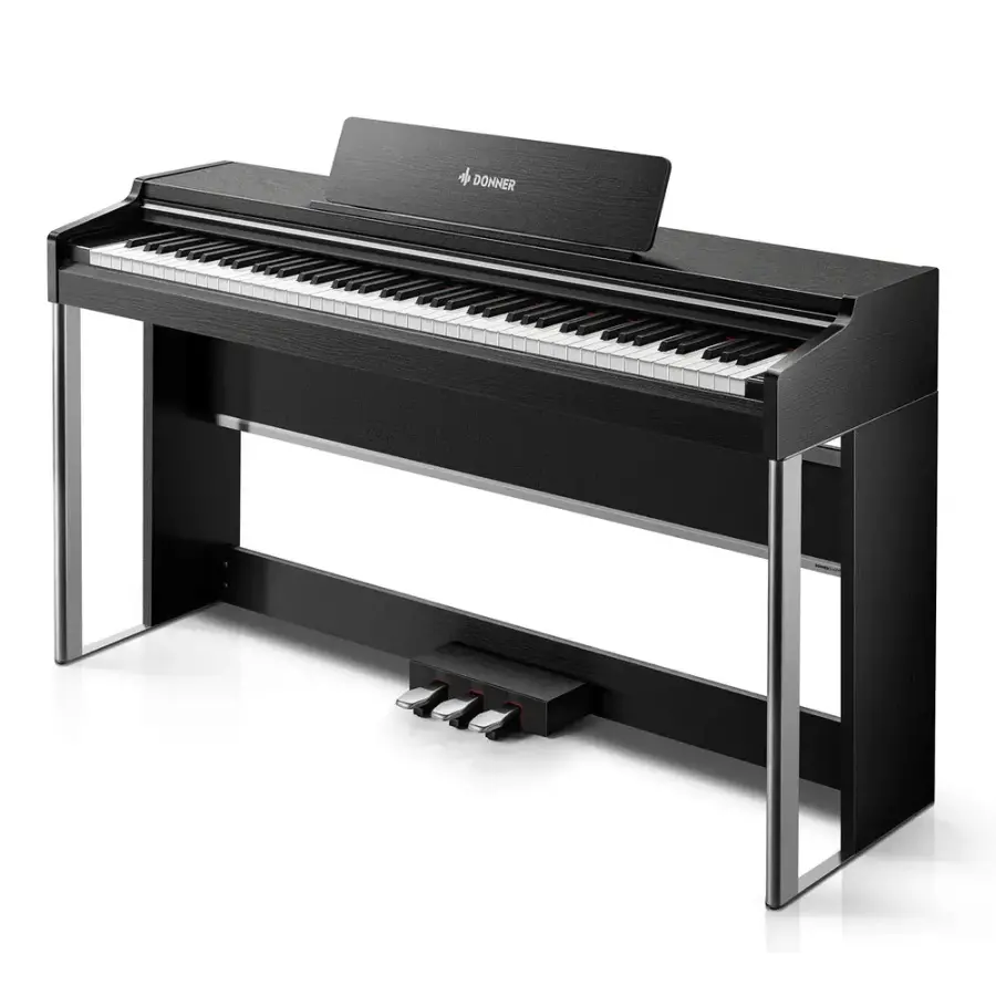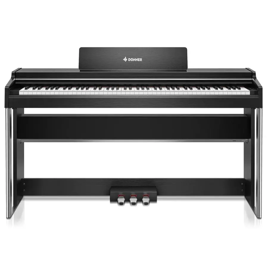 Gelince Haber VerAkustik piyanonun hissini modern bir arayüzle birleştiren Donner DDP-200 Pro (Siyah), graded hammer action klavyesi, 256 notalık polifonisi ve 2.4” IPS dokunmatik ekranı ile çalışmayı akıcı hâle getirir. Dahili 2×25 W stereo hoparlörler oda içinde dolgun bir ses sunar; 138 ton / 120 ritim / 130 demo içeriği ve kayıt–çalma, öğrenme fonksiyonlarıyla günlük egzersizden performansa uzanan geniş bir kullanım alanı yaratır. USB-MIDI ve çift modlu Bluetooth bağlantıları, uygulamalar ve DAW’larla sorunsuz entegrasyon sağlar; kutudan çıkan 3 pedallı ünite ile klasik pedal kontrolü eksiksiz tamamlanır.