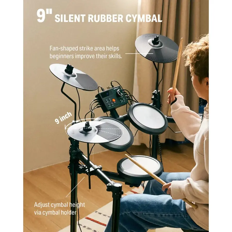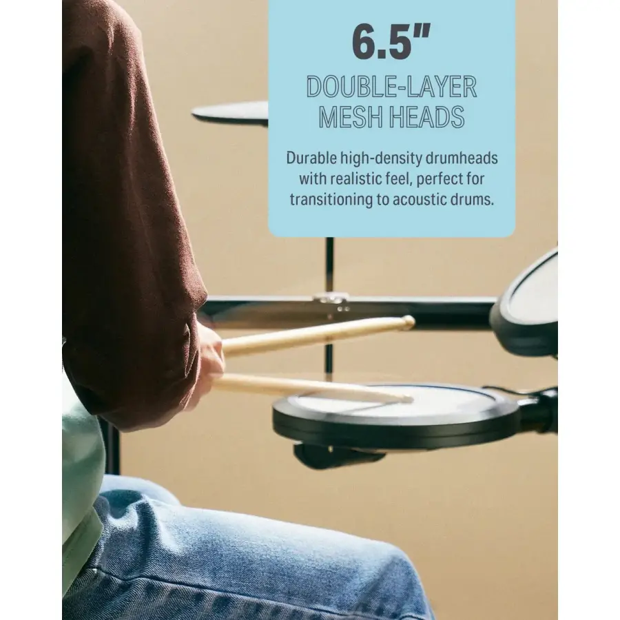 Kutu içeriği: Mesh trampet ve tomlar, hi-hat/crash/ride zilleri, 2 pedal, davul taburesi, kulaklık, baget.