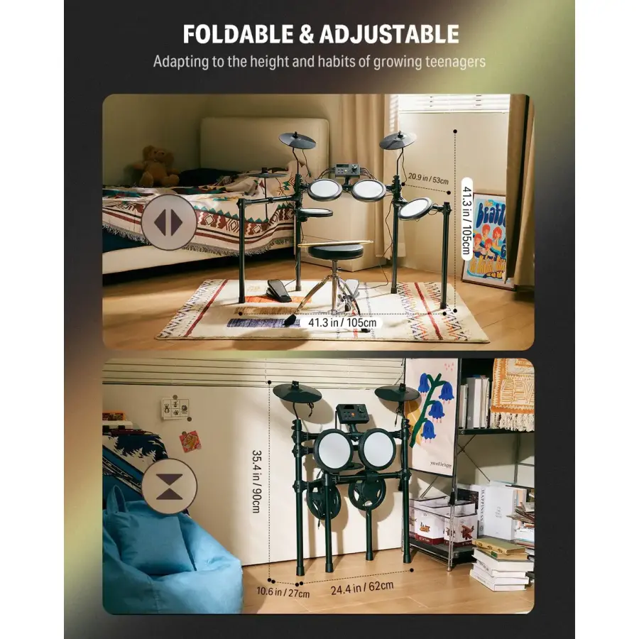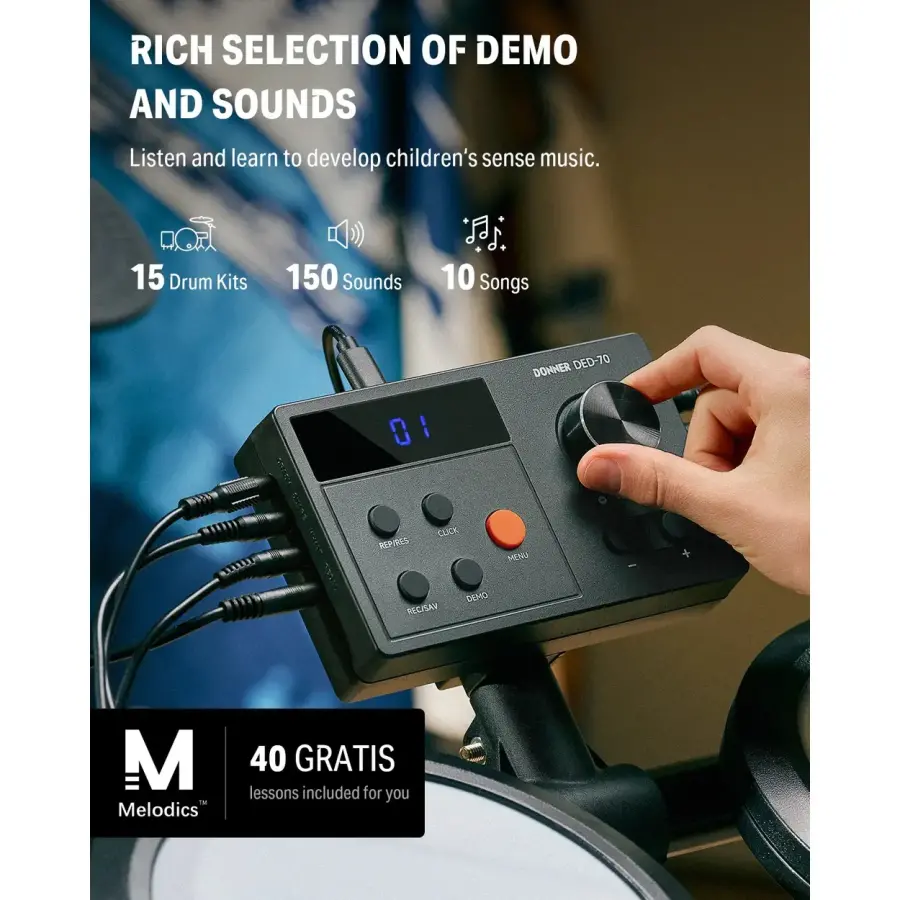 Gelince Haber VerEvde, kursta ve sahne öncesi prova düzeninde sessiz ve gerçekçi bir davul hissi arayan başlangıç seviyesindeki davulcular için Donner DED-70; çift katmanlı mesh pedleri, kullanımı kolay modülü ve zengin aksesuar içeriğiyle pratik, kompakt ve motive edici bir set sunar. 4× 6.5" çift katmanlı mesh pad ve 3× 9" kauçuk zil (hi-hat, crash, ride) akustik davula yakın geri tepme ve kontrol sağlar; apartman ortamında sessiz çalışmayı destekler. Kutudan davul taburesi, kulaklık ve baget ile birlikte çıkar; katlanabilir, yüksekliği ayarlanabilir rack yapısı hızlı kurulum ve kolay saklama imkanı verir. 150 ses, 15 özelleştirilebilir kit ve 10 demo ile farklı tarzlara hızla uyum sağlarsınız.