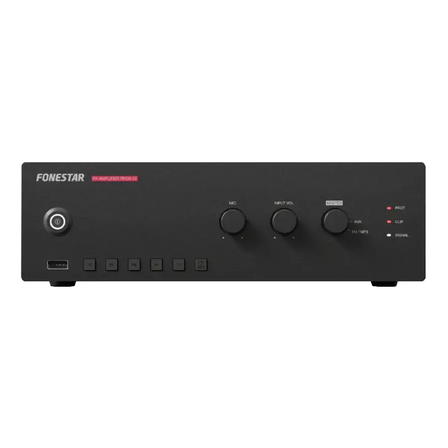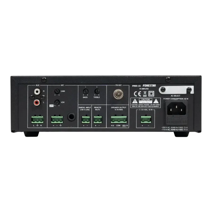 Güvenli bağlantı sağlayan euroblock konnektörler, koruma göstergeleri ve fan kullanılmadan yapılan endüksiyon soğutma sistemiyle dayanıklı ve güvenilir bir kullanım sağlar. Fonestar PROX-15, mağazalar, restoranlar, kafeler, okullar, anıtlar, sergiler ve hatta anons araçları gibi 100V hatlı veya düşük empedanslı ses sistemleri için ideal bir çözümdür.
