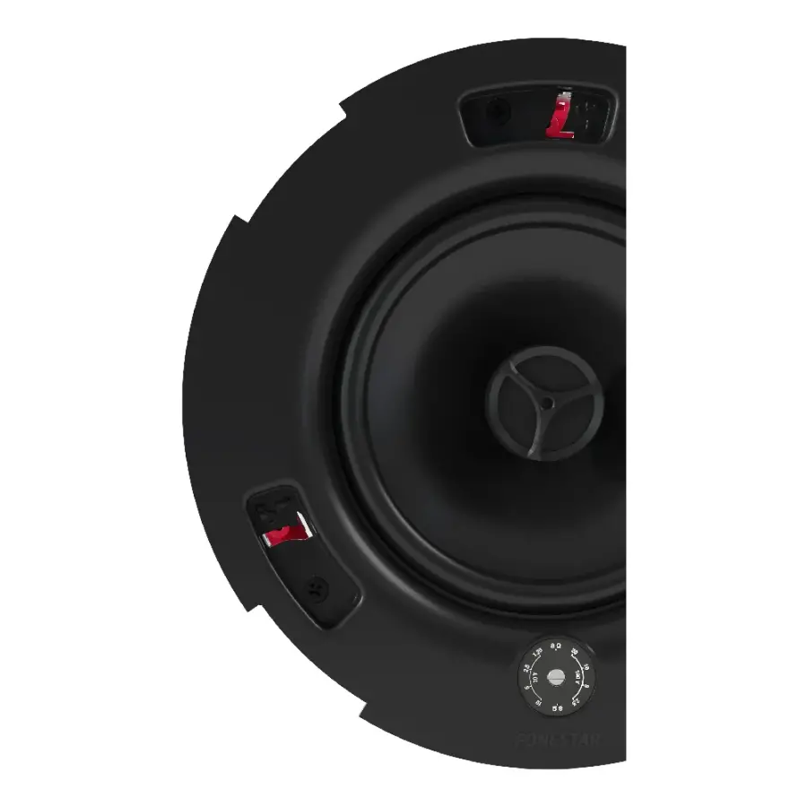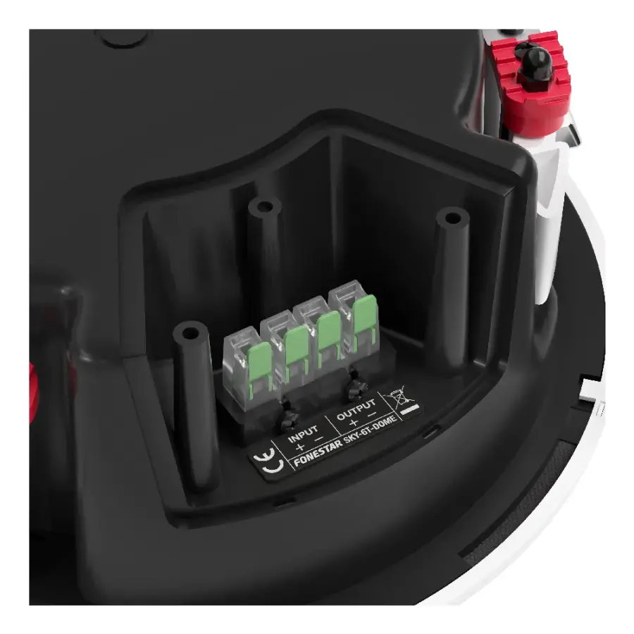 Fonestar SKY-6T-DOME, montaj kolaylığı sağlayan hızlı bağlantı terminalleri, antidüşme sistemi, güvenlik kablosu kancası ve sağlam tavan montaj aparatlarıyla kullanıcı dostu bir kurulum sunar. Ön panelden erişilebilen güç seçici anahtar, 100V hat veya 8Ω düşük empedans ayarı yapılmasına imkân tanır.