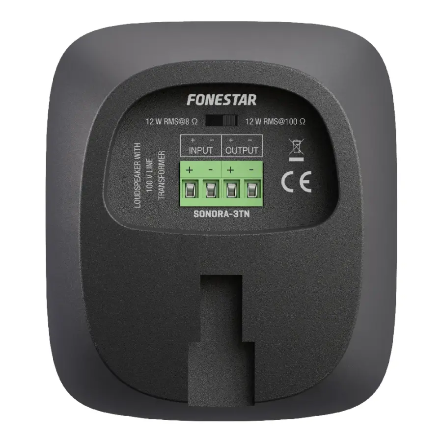 3” woofer sürücüsü sayesinde 130 Hz – 20 kHz aralığında net ve distorsiyonsuz ses üreten SONORA-3TN, yüksek ses kalitesini kompakt boyutlarla buluşturur. Hoparlör, yüksek empedans (100V) ve düşük empedans (8Ω) arasında kolayca geçiş yapılabilen bir seçici anahtara sahiptir. Ayrıca Euroblock giriş-çıkış bağlantıları sayesinde güvenli ve pratik kablolama imkânı sunar.