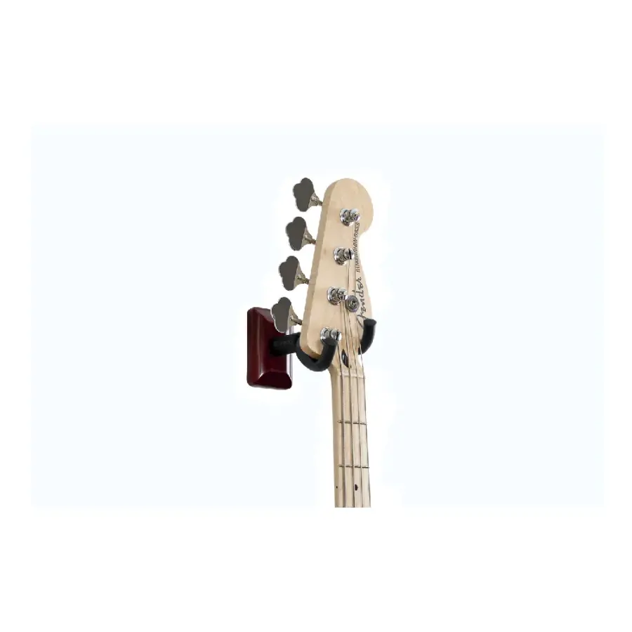 Siyah ara mesafe gövdesi, hem düz hem de açılı kafa tasarımına sahip gitarlar için duvardan yeterli boşluk sağlayarak temas riskini azaltır. Kiraz kaplamalı dekoratif duvar plakası, montaj vidalarını gizleyerek temiz ve profesyonel bir görünüm kazandırır.