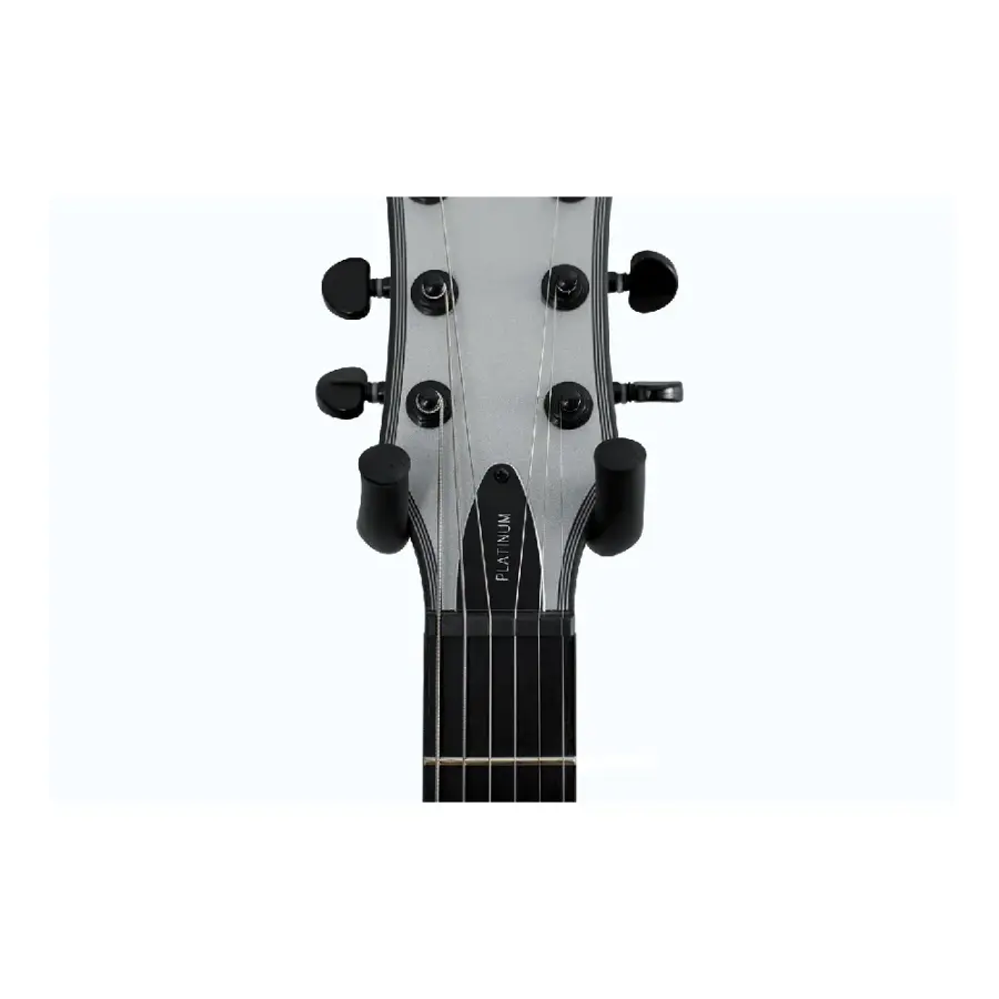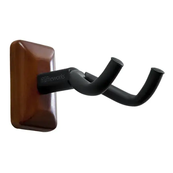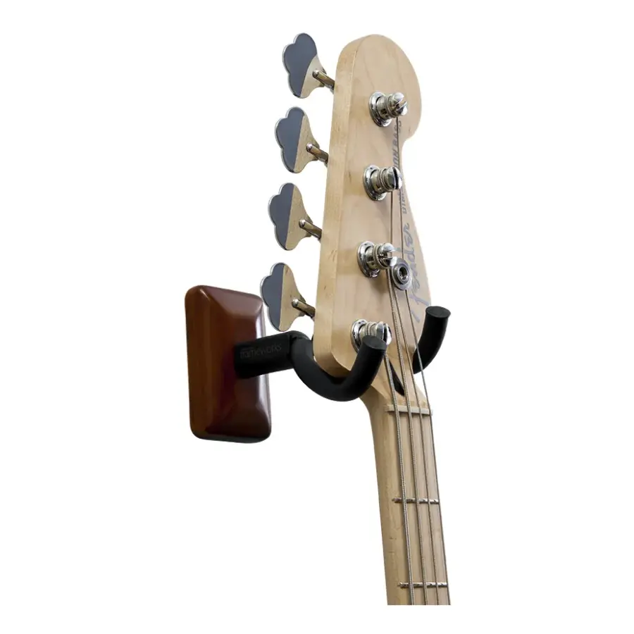 Siyah ara mesafe gövdesi, hem düz hem de açılı kafa tasarımına sahip gitarlar için duvardan yeterli boşluk sağlayarak temas riskini azaltır. Maun kaplamalı dekoratif duvar plakası, montaj vidalarını gizleyerek temiz ve profesyonel bir görünüm kazandırır.