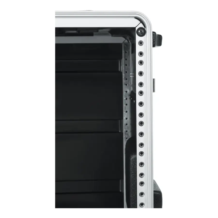 Hafif ve darbelere dayanıklı polietilen (PE) gövde, roadcase alternatifi olarak yüksek koruma sağlarken taşımada avantaj sunar. Ön ve arka bölümde yer alan dişli, sahada değiştirilebilir 7 mm çinko kaplı çelik rack rayları, ekipman montajında uzun ömürlü ve güvenli kullanım sağlar.