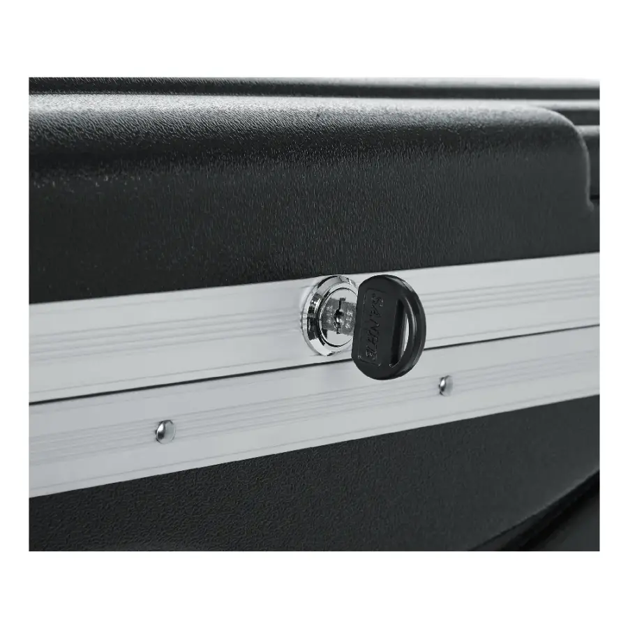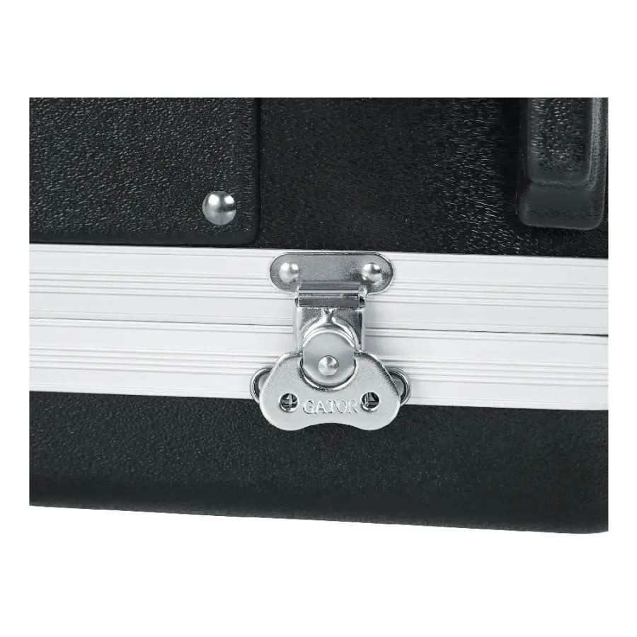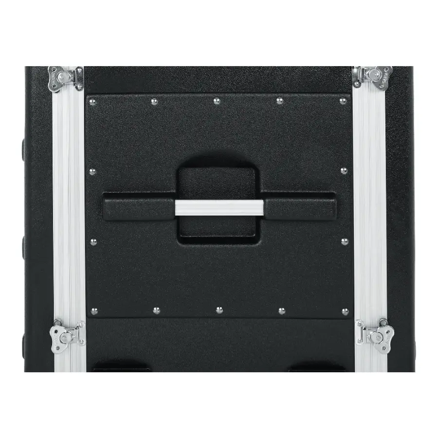 Kabin üzerinde yer alan ağır hizmet tipi kilitli mandallar, taşıma sırasında kapakların güvenli biçimde kapalı kalmasını sağlar. Kilitlenebilir ön ve arka kapaklar, ekipmanların yetkisiz erişime karşı korunmasına yardımcı olur. Siyah renkli dış yüzey, profesyonel sahne ve kurulum ortamlarıyla uyumlu bir görünüm sunar.