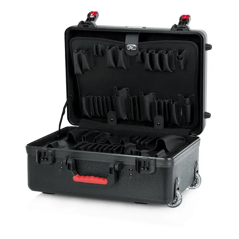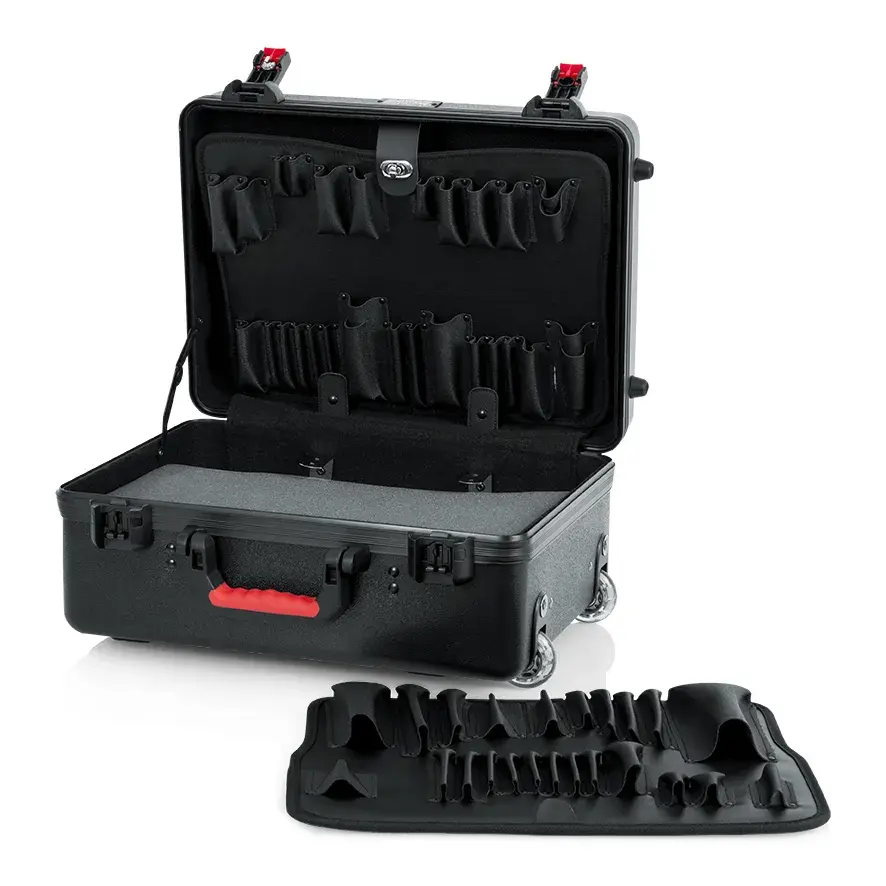 İç bölümde bulunan iki adet çıkarılabilir standart alet paleti, ekipmanların düzenli ve erişilebilir şekilde yerleştirilmesine olanak tanır. TSA onaylı kilitlenebilir mandal sistemi, özellikle uçak yolculuklarında güvenli kullanım sunar. Ergonomik enjeksiyon kalıplı taşıma sapı, geri çekilebilir çekme kolu ve gömme tekerlekler, uzun mesafeli taşımalarda kullanıcı konforunu artırır.