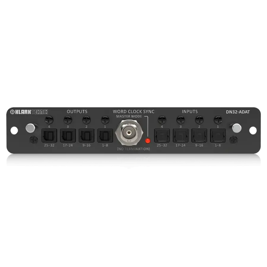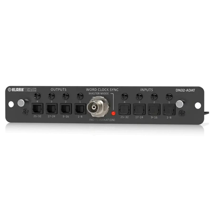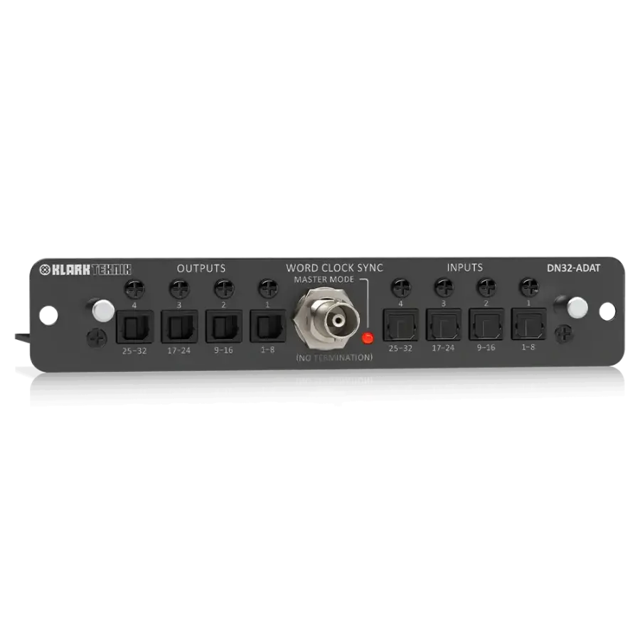 4 çift optik fiber Toslink* konnektör üzerinden 32 kanala kadar ADAT giriş/çıkış sağlayabilen DN32-ADAT, 24-bit sinyal iletimi ve 44.1 ya da 48 kHz örnekleme hızı seçenekleri sunar. Işıkla veri ileten optik fiber bağlantılar, mutlak galvanik izolasyon sağlayarak topraklama döngüsü kaynaklı parazitleri tamamen ortadan kaldırır ve üstün sinyal bütünlüğü sunar.