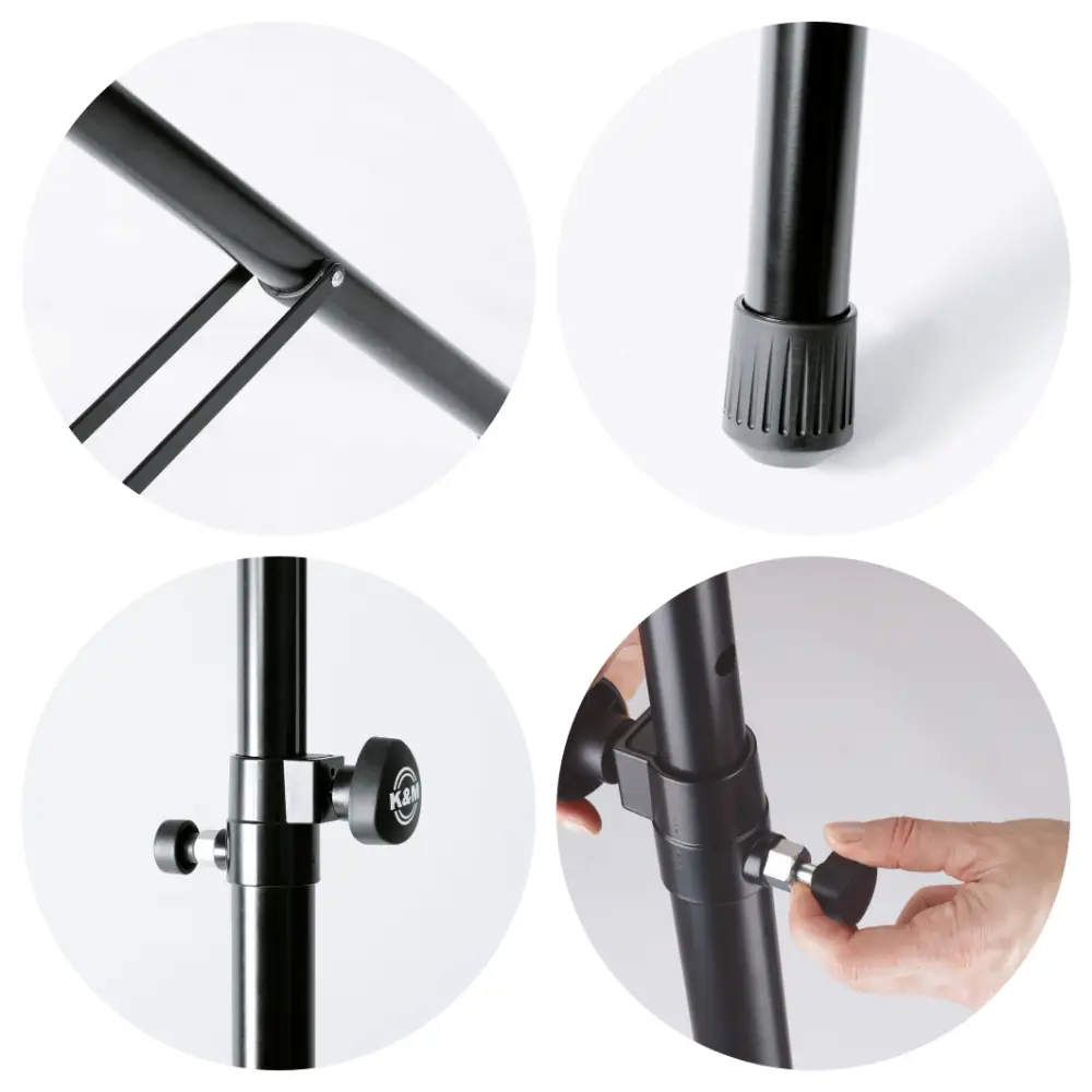 Dünya çapında kabul gören: hoparlör standı 214/6 - sağlam ve dayanıklı. Tüm kelepçeler yüksek kaliteli çinko dökümdür. Ayak yapısı ve büyük sabit ayak uç kapakları güvenliği ve dengeyi artırır. Diğer özellikler, uzatma borusu için dışarı çekilebilir koruma, entegre anti-şok bileşeni ve yaylı cıvata ve kilitleme vidası ile rahat yükseklik ayarıdır. Uzatma çubuğu üzerinde bir montaj yardımcısı ile birlikte gelir.