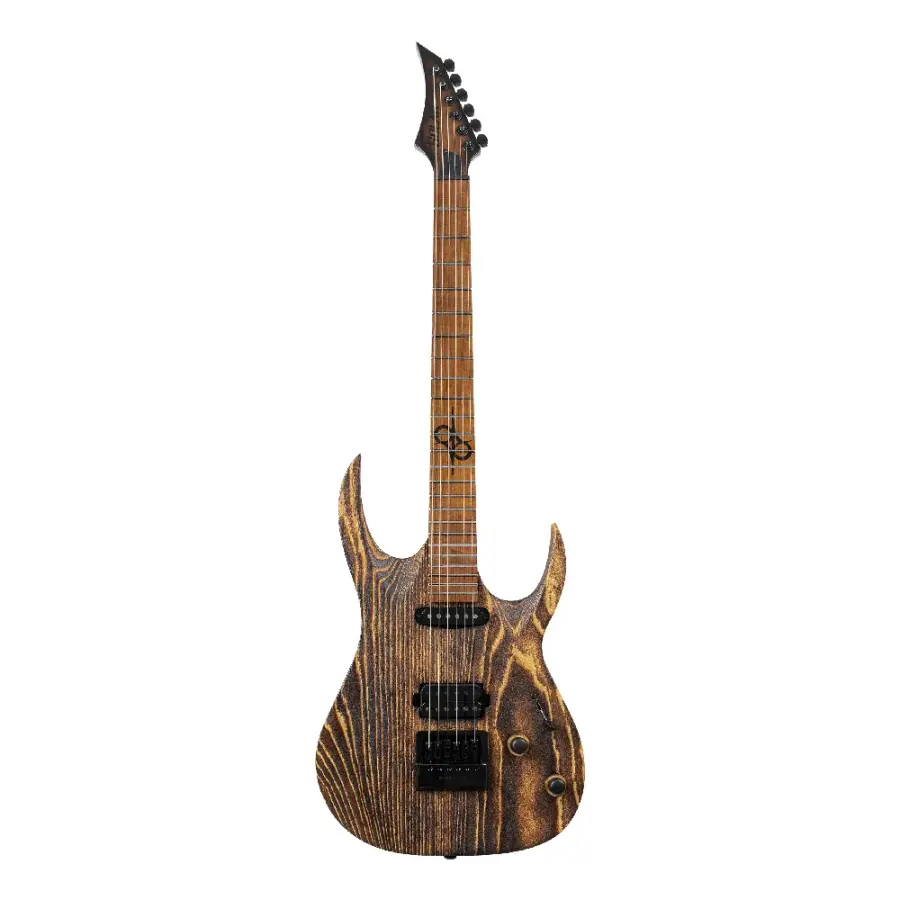 Swamp Ash gövde ve 3 parçalı roasted maple sap kombinasyonu güçlü sustain ve net artikülasyon sunar. 25.5” skala, C Solar sap profili ve 24 paslanmaz çelik perde modern ve teknik çalımlar için yüksek konfor sağlar.