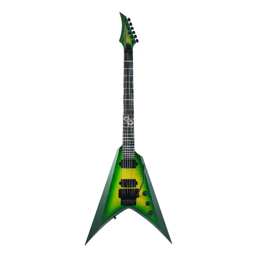 Solar V1.6FRLB, çarpıcı Flame Lime Burst Matte kaplaması ve agresif V kasa tasarımı ile sahnede maksimum dikkat çeken profesyonel bir elektro gitardır. Modern metal ve yüksek gain tonlar için optimize edilmiştir.
