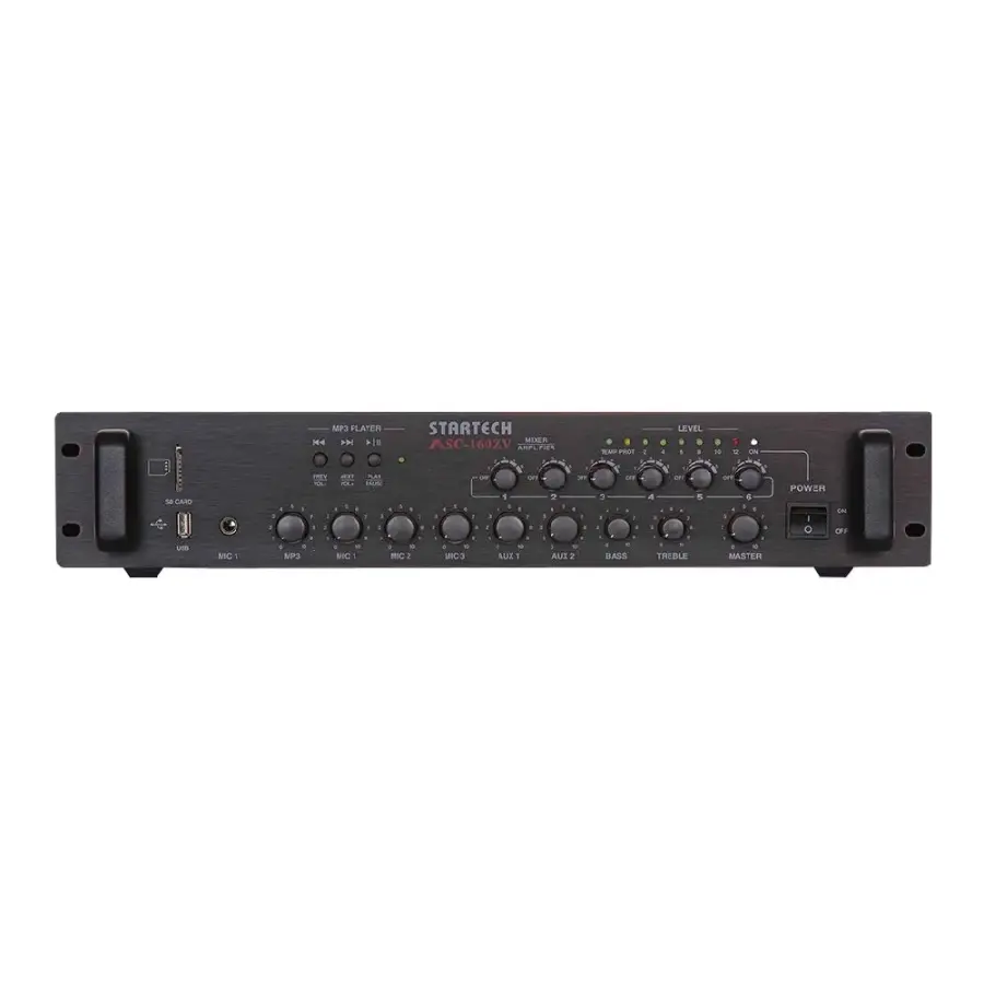 Startech ASC-160ZV, anons ve arka plan müzik sistemleri için geliştirilmiş, 6 bölgeli hoparlör kontrolüne sahip 160 Watt gücünde profesyonel bir mikser amplifikatördür. 2U rack mount tasarımı, çoklu giriş seçenekleri ve hat trafolu çıkış desteği sayesinde okul, cami, ofis, mağaza ve ticari alanlarda güvenle kullanılabilir.