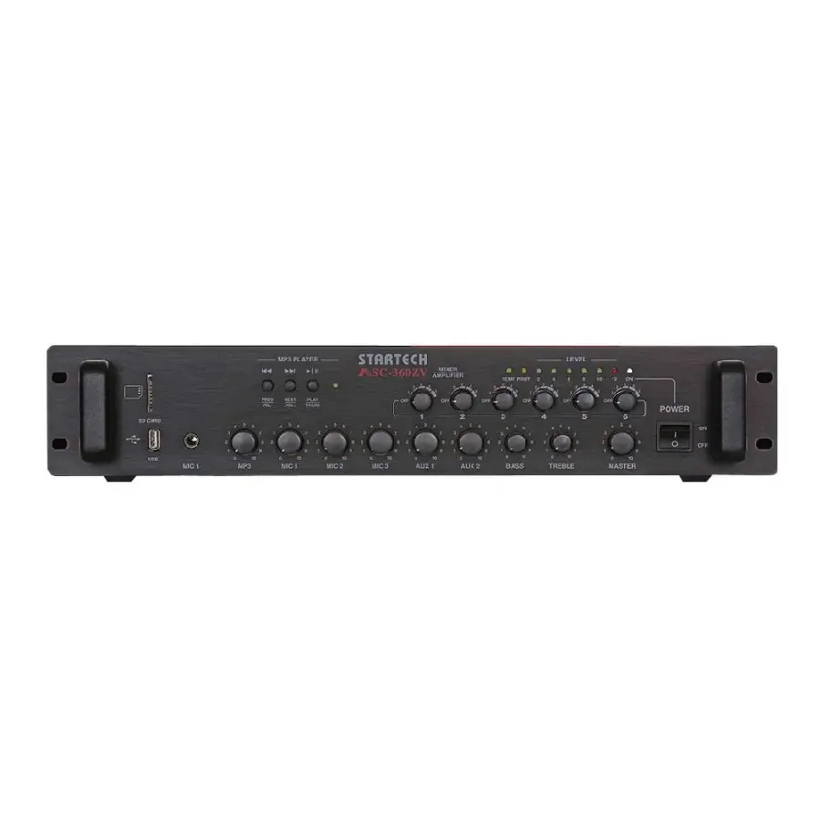 Startech ASC-360ZV, anons ve arka plan müzik sistemleri için geliştirilmiş, 6 bölgeli hoparlör kontrolüne sahip 360 Watt gücünde profesyonel bir mikser amplifikatördür. 2U rack mount tasarımı, çoklu giriş seçenekleri ve hat trafolu çıkış desteği sayesinde cami, okul, hastane, AVM ve endüstriyel tesislerde güvenli ve esnek kullanım sunar.
