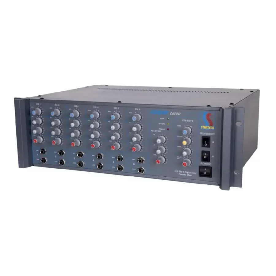 Startech COOPER REV C6300, 300 Watt dahili amplifikatörü ve kompakt rack tipi tasarımı ile küçük ve orta ölçekli ses sistemleri için geliştirilmiş pratik bir power mikser modelidir. 4 Ohm düşük empedanslı hoparlör çıkışı sayesinde standart pasif hoparlörleri güvenli ve dengeli şekilde sürer.