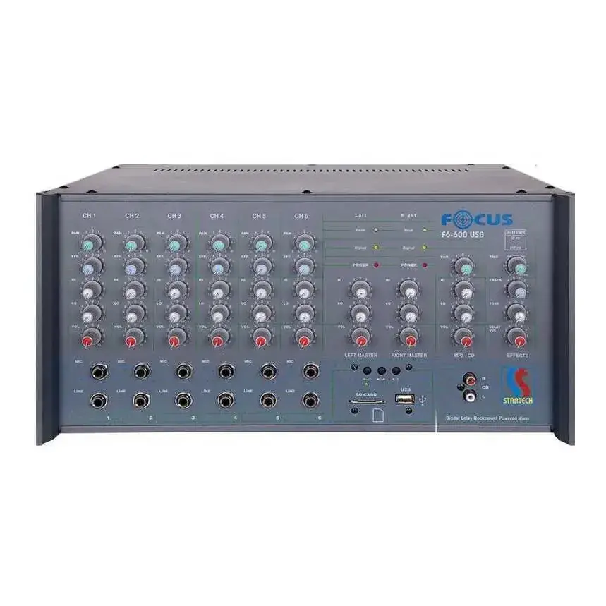 Startech Focus F6-600 USB, kompakt yapısı ve 2 x 300 Watt dahili amplifikasyon gücü ile küçük ve orta ölçekli sahne uygulamaları, okul etkinlikleri ve organizasyonlar için tasarlanmış pratik bir power mikser modelidir. 6 kanal yapısı sayesinde mikrofon ve enstrüman bağlantıları için yeterli kapasite sunar.