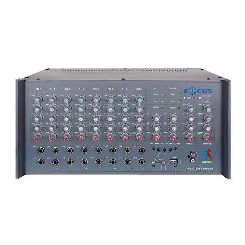 Startech Focus F8-600 USB, sabit kurulum projeleri için tasarlanmış 2 x 300 Watt gücünde 70V / 100V trafo çıkışlı bir power mikser modelidir. Okul, cami, konferans salonu, otel ve geniş alan seslendirme sistemlerinde uzun mesafeli hoparlör hatları için ideal bir çözümdür.