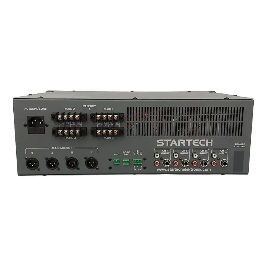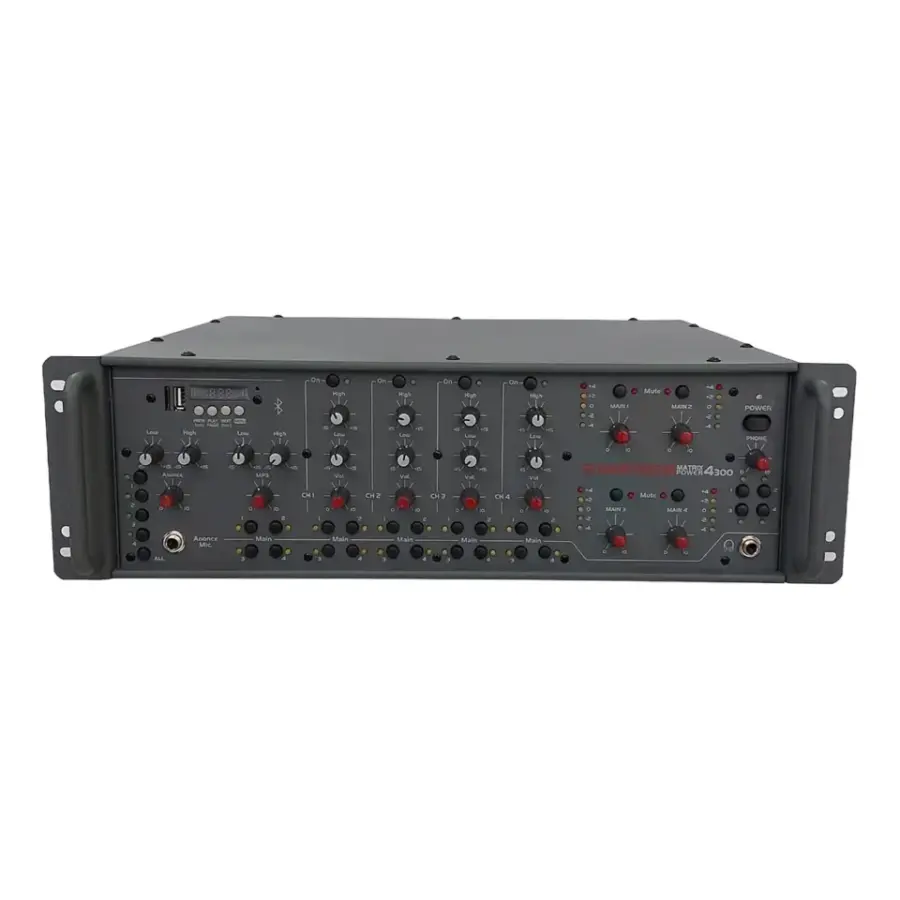 Startech MATRIX POWER 4300, çok bölgeli anons ve seslendirme projeleri için geliştirilmiş profesyonel bir rack tipi mikser amplifikatördür. 4x300 Watt çıkış gücü sayesinde 4 ayrı hat üzerinde bağımsız güç dağılımı sağlar. 4 Ohm, 70V ve 100V hat desteği ile hem düşük empedanslı hem de sabit voltajlı hoparlör sistemleriyle uyumlu çalışır.