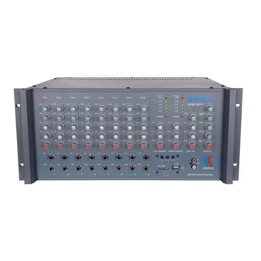 Startech Safir S8-800 USB Kombine Model, hem 4 Ohm düşük empedanslı hoparlör sistemleri hem de 70V / 100V hat tipi trafo hoparlör sistemleri ile çalışabilen çok yönlü bir power mikser çözümüdür. 2 x 400 Watt çıkış gücü sayesinde sahne uygulamaları ve sabit kurulum projelerinde esnek kullanım imkanı sunar.