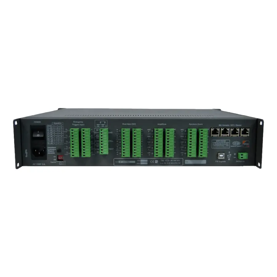 EN 54-16 gerekliliklerine uygun olarak tasarlanan MT 9000 EX, ana ve yedek amplifikatör girişleri, 19” rack kabin uyumlu yapısı ve güvenilir çalışma mimarisi ile büyük ölçekli profesyonel acil anons projelerinde ideal bir genişleme çözümüdür.