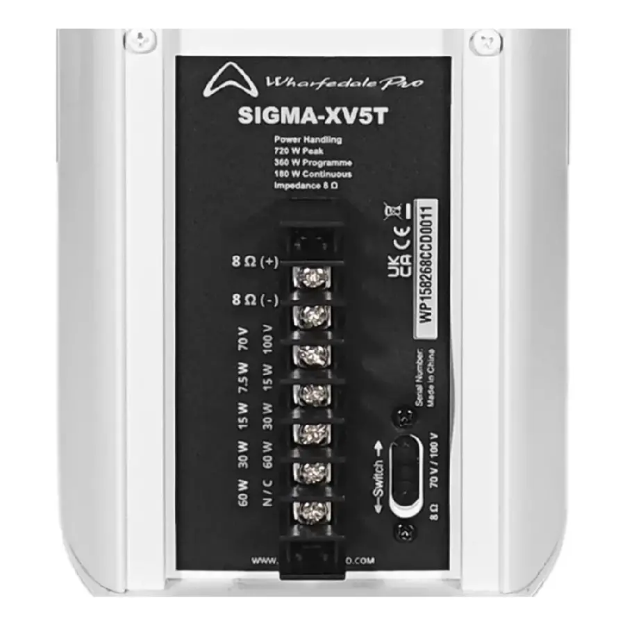 SIGMA-XV5T, entegre trafosu sayesinde 70V ve 100V sistemlerle tam uyumludur. 70V: 7.5 / 15 / 30 / 60 W — 100V: 15 / 30 / 60 W tap seçenekleri, her mekânda optimum güç dağılımına olanak sağlar. Sağlam alüminyum gövde, çelik ön ızgara ve Tough-Tone boya kaplama uzun ömürlü kullanım sunar. Ürün kutusunda iki adet duvar montaj aparatı yer alır.