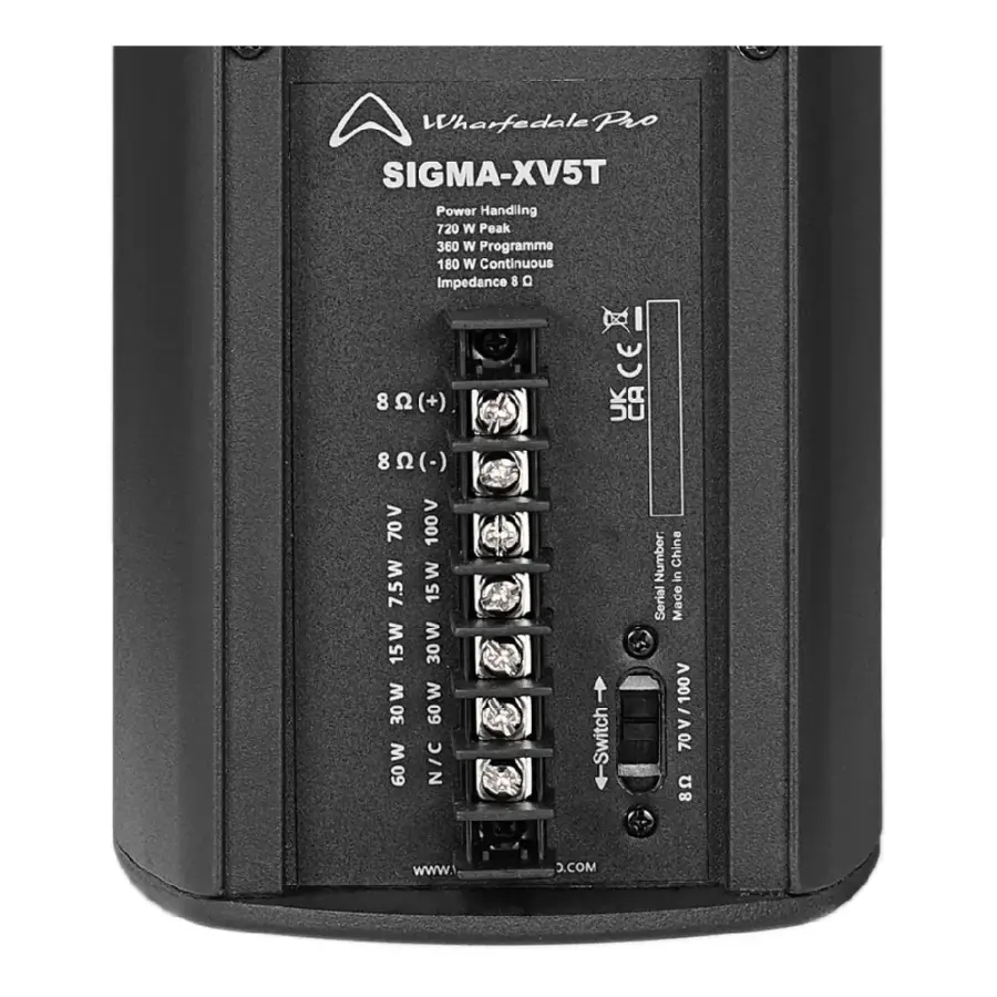 SIGMA-XV5T, entegre trafosu sayesinde 70V ve 100V sistemlerle tam uyumludur. 70V: 7.5 / 15 / 30 / 60 W — 100V: 15 / 30 / 60 W tap seçenekleri, her mekânda optimum güç dağılımına olanak sağlar. Sağlam alüminyum gövde, çelik ön ızgara ve Tough-Tone boya kaplama uzun ömürlü kullanım sunar. Ürün kutusunda iki adet duvar montaj aparatı yer alır.