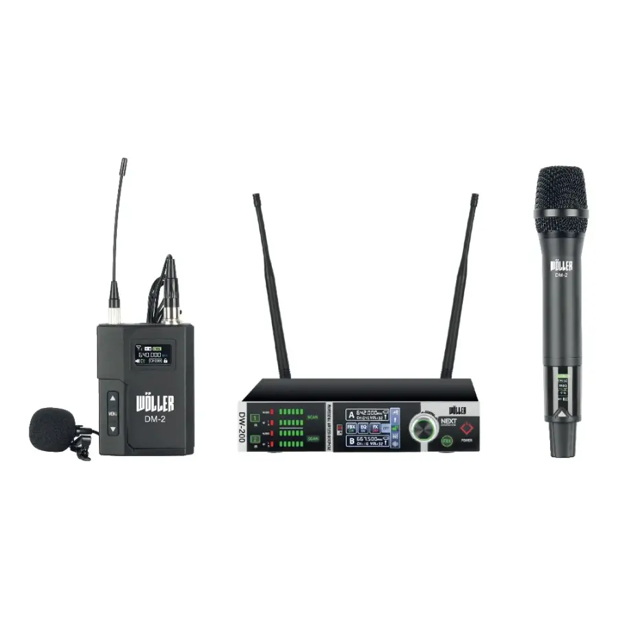 Wöller DW-200EY, sahne, konferans, eğitim ve organizasyon uygulamaları için geliştirilmiş çift kanallı UHF kablosuz mikrofon seti modelidir. Set içeriğinde bir adet el mikrofonu ve bir adet yaka (lavalier) mikrofon bulunur. True Diversity alıcı teknolojisi ve dijital modülasyon yapısı sayesinde kararlı, net ve parazitsiz ses iletimi sağlar.