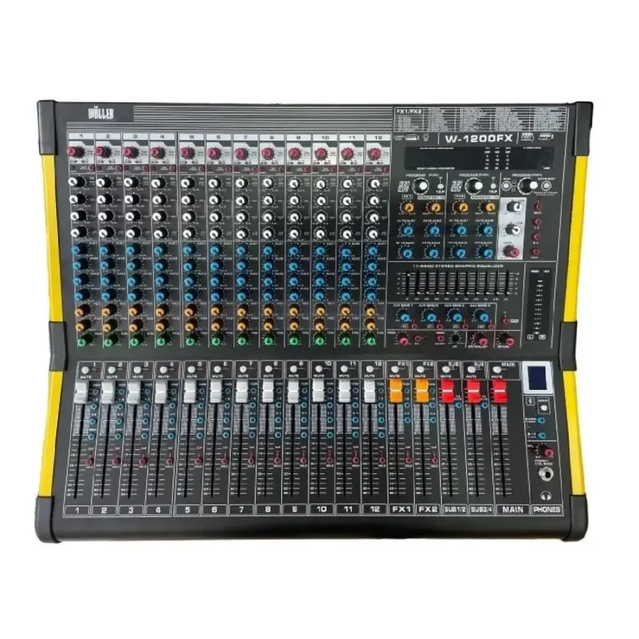 Wöller W-1200FX, sahne performansları, canlı yayınlar, kayıt stüdyoları ve DJ setupları için tasarlanmış profesyonel bir 12 kanallı deck mikserdir. 12 mono girişe sahip yapısı, geniş bağlantı imkânı ve esnek miksaj kabiliyetiyle her türden ses uygulamasında yüksek performans sağlar. 4’lü tonlama sistemi ve 11 bant ekolayzer, ses frekanslarını hassas bir biçimde ayarlayarak temiz, güçlü ve dengeli bir ses sunar.