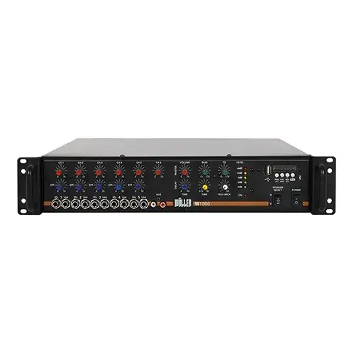 Wöller W-1300 Mono Mikser Amfi, güçlü çıkış kapasitesi ve çok yönlü bağlantı seçenekleriyle profesyonel ses sistemleri için ideal bir çözümdür. Maksimum 300 Watt çıkış gücü sunan bu model, 70-100V hat sistemlerine ve 4-16 Ohm hoparlör çıkışlarına uyum sağlayarak farklı mekanlarda esnek kullanım imkânı verir.