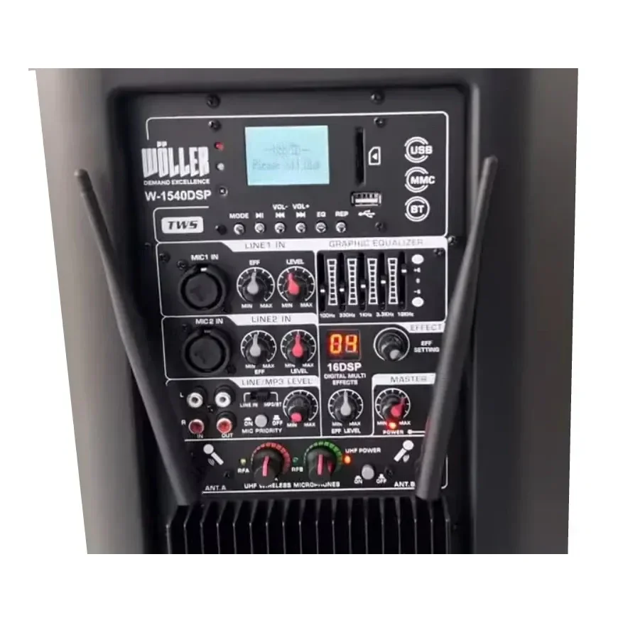 Sistemde yer alan 16 adet DSP efekt, vokal ve enstrüman performanslarını zenginleştirerek canlı ses deneyimini bir üst seviyeye taşır. Bluetooth, USB, SD kart ve TWS bağlantı desteği sayesinde farklı cihazlardan müzik çalabilir; mikrofon ve enstrüman girişleri sayesinde sahne performanslarını kolaylıkla gerçekleştirebilirsiniz.