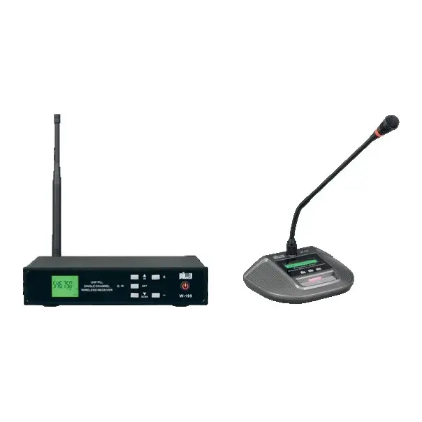 Wöller W-199K Tek Kanal Kablosuz Dijital Kürsü Mikrofonu Seti, konferanslar, sunumlar, toplantılar ve resmi konuşmalar için tasarlanmış profesyonel bir kablosuz mikrofon çözümüdür. UHF frekans bandında çalışan sistem, parazit ve kesinti risklerini minimuma indirerek geniş mekânlarda stabil ve yüksek kaliteli ses iletimi sağlar.