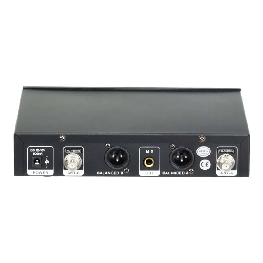 500–590 MHz arasında çalışan geniş UHF frekans aralığı, uzun mesafe iletimlerde stabil performans sunarken; LED ekranlı alıcı birimi, frekans, kanal ve sinyal seviyesini net bir şekilde görüntüleyerek kullanıcıya kolay kontrol avantajı sağlar.
