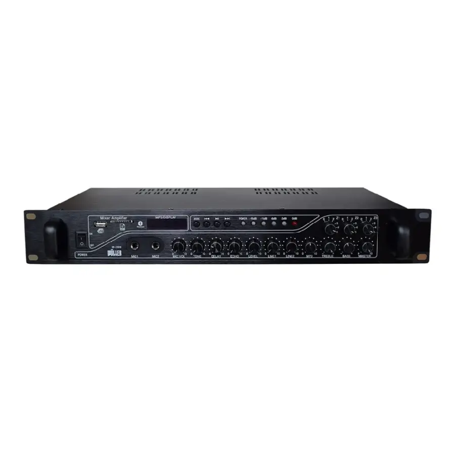 Wöller W-3300, geniş kapsamlı sabit seslendirme projeleri için yüksek güç, esneklik ve profesyonel kontrol sunan gelişmiş bir 100V hat trafolu mikser amplifikatördür. Maksimum 300 Watt çıkış gücü ile büyük ölçekli işletmeler, market zincirleri, okullar, ibadethaneler, oteller, spor tesisleri ve çok bölmeli ticari alanlarda güçlü ve kararlı bir performans sağlar. 3 bağımsız bölge kontrolü sayesinde farklı alanların ses seviyeleri tek cihaz üzerinden ayrı ayrı yönetilebilir, bu da W-3300’ü çok bölgeli anons ve müzik sistemlerinin ideal çözümü haline getirir. USB/SD Kart ve Bluetooth medya desteği, modern kaynaklara kolay erişim imkânı sunarken iki mikrofon girişi günlük duyurular, toplantılar ve etkinlikler için geniş kullanım esnekliği sağlar. Anons sırasında otomatik müzik kesme (priority/VOX) özelliği ile duyuruların netliği garanti edilir. Bass/Tiz/Echo kontrolleri ise ses karakterini detaylı şekilde şekillendirme olanağı tanır. Uzaktan kumanda desteğiyle kullanım kolaylığı artırılan Wöller W-3300, büyük ölçekli kurumsal ses sistemlerinde güçlü ve güvenilir bir çözüm olarak öne çıkar.