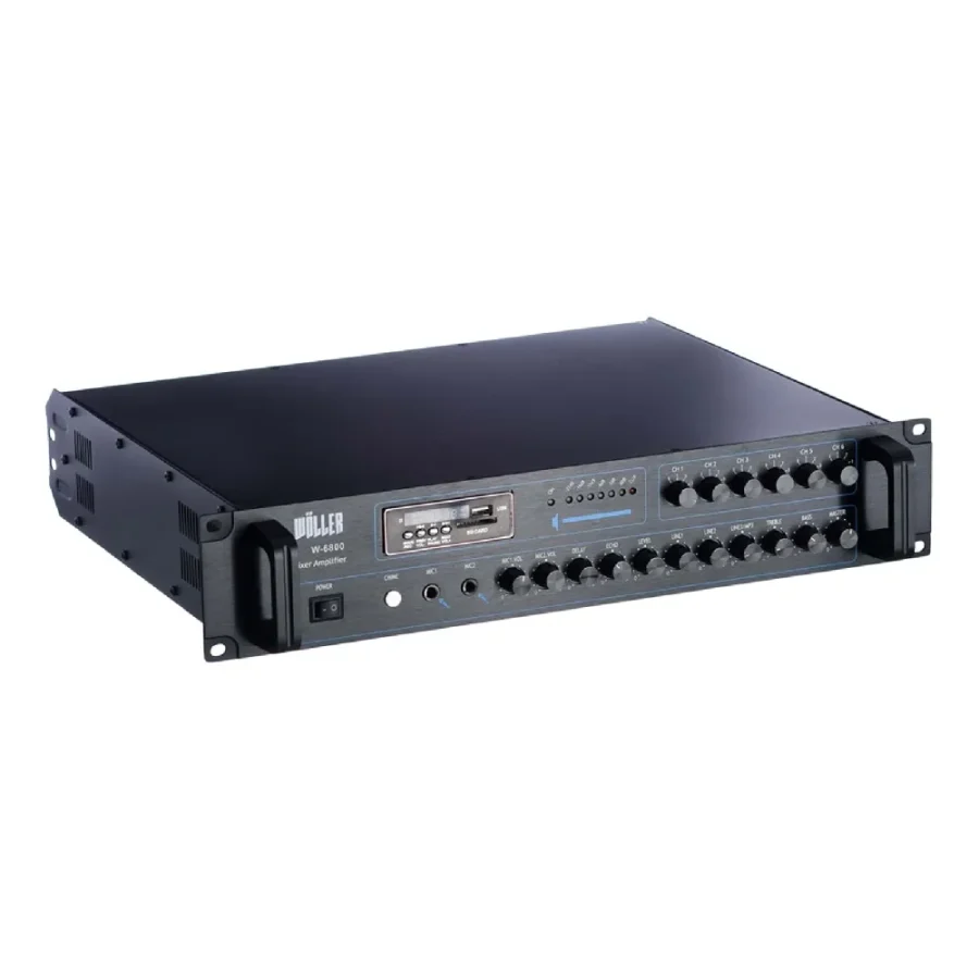 Wöller W-6800, çok büyük ölçekli sabit seslendirme projelerinde maksimum güç, kapsamlı kontrol ve profesyonel duyuru özellikleri sunmak üzere tasarlanmış üst seviye bir 100V hat trafolu mikser amplifikatördür. Maksimum 800 Watt çıkış gücü ile AVM’ler, üniversite kampüsleri, hastaneler, oteller, ibadethaneler, endüstriyel tesisler ve geniş kurumsal komplekslerde yüksek verimlilik ve güçlü performans sağlar. 6 bağımsız bölge kontrolü sayesinde her bölge ayrı ayrı yönetilebilir, böylece geniş alanlarda ses dağılımı son derece esnek ve kontrollü biçimde sağlanır. USB/SD Kart ve Bluetooth medya desteği modern cihazlarla tam uyumluluk sunarken, iki mikrofon girişi duyuru, bilgilendirme ve acil durum anonsları için geniş kullanım imkânı sunar. Anons sırasında otomatik müzik kesme özelliği ve Ding-Dong ön anons fonksiyonu, duyuruların öncelikli ve net şekilde iletilmesini sağlar. Bass, Tiz ve Echo ton kontrolleri ile ses karakteri detaylı şekilde düzenlenebilir. Uzaktan kumanda desteği ise büyük yapılarda kullanım kolaylığını artırarak Wöller W-6800’ü yüksek güçlü ve profesyonel sabit ses sistemleri için ideal bir çözüm haline getirir.