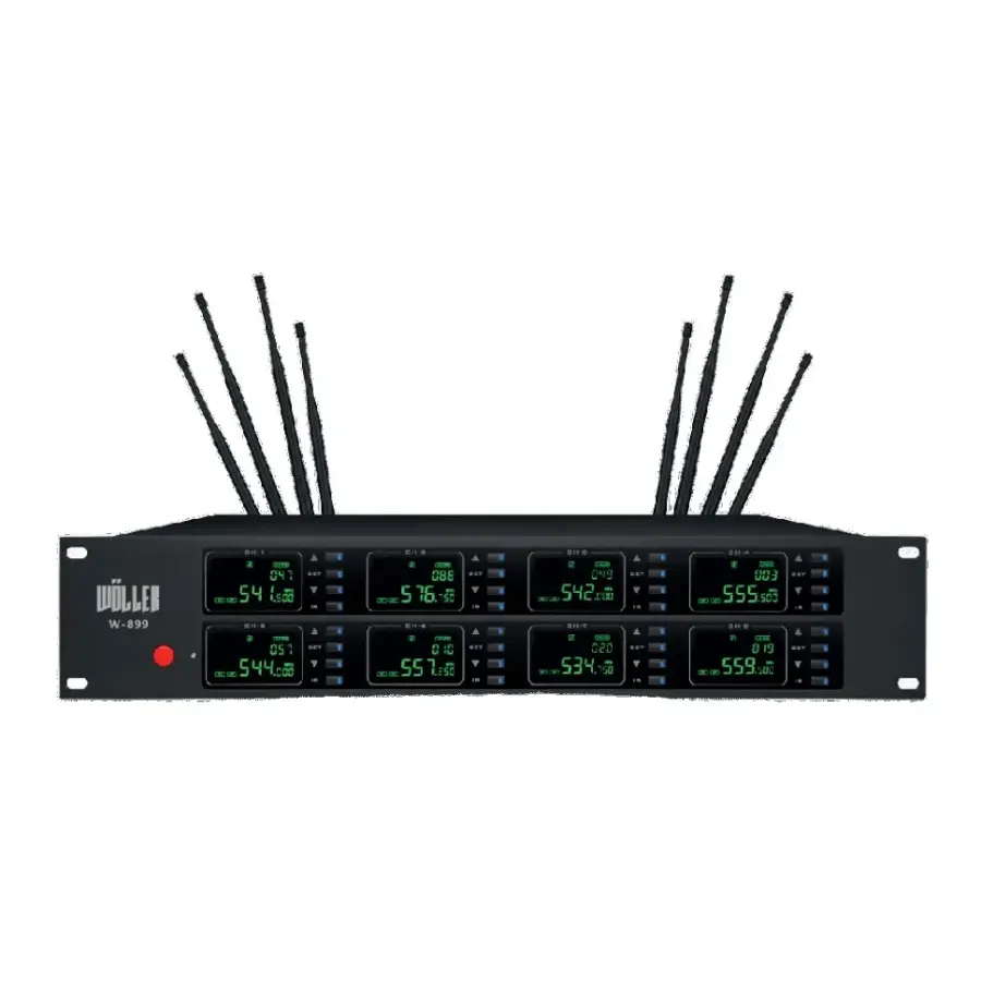 Wöller W-899R, profesyonel ses sistemleri ve büyük ölçekli sahne uygulamaları için geliştirilmiş 8 kanallı UHF kablosuz mikrofon alıcı sistemidir. Gelişmiş dijital modülasyon teknolojisi sayesinde net, kararlı ve parazitsiz ses aktarımı sunar. 8x99 farklı değiştirilebilir frekans seçeneği ile yoğun sinyal trafiğine sahip ortamlarda dahi kesintisiz çalışma imkânı sağlar. 500–590 MHz geniş frekans aralığı ve 30Hz–30kHz frekans tepkisi ile doğal ses karakterini bozmadan yüksek çözünürlüklü ses sunar. LED ekranlı kontrol paneli sayesinde her kanalın frekans, sinyal ve bağlantı durumları kolaylıkla izlenebilir. Wöller W-899R, W-23, W-24, W-25 ve W-26 mikrofon modelleri ile tam uyumlu olarak çalışır.