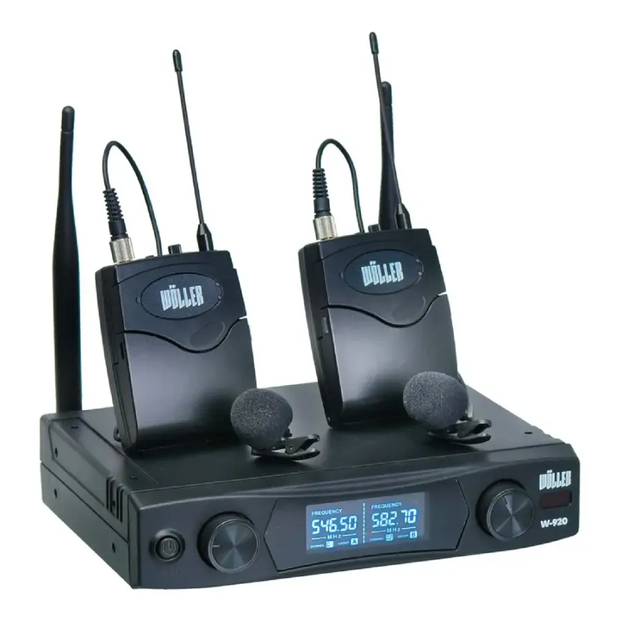 Wöller W-920YY, profesyonel ses uygulamaları için geliştirilmiş, iki yaka mikrofonu ile donatılmış çift kanallı UHF kablosuz mikrofon sistemidir. Geniş frekans aralığı ve dijital modülasyon teknolojisi sayesinde parazitsiz, net ve güçlü bir ses aktarımı sağlar. 500–590 MHz aralığında çalışan sistem, sahne, konferans, eğitim ve ibadet alanları gibi ortamlarda kesintisiz iletişim ve yüksek ses kalitesi sunar. LED ekranlı alıcısı, sinyal gücü, frekans ve kanal bilgilerini kolayca izleme imkânı tanır. Kompakt verici üniteleri, kullanıcıya özgür hareket alanı sağlayarak konforlu bir deneyim sunar.