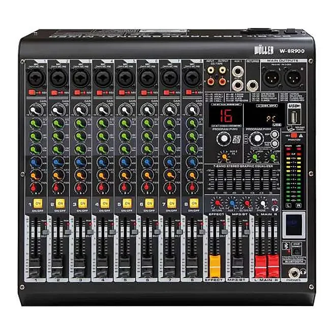 Wöller W8R900 8 Kanal Power Mikser, kompakt boyutuna rağmen güçlü ses performansı, geniş bağlantı seçenekleri ve üstün ton kontrolüyle profesyonel sahne ve kayıt uygulamaları için tasarlanmıştır. 8 adet mono giriş ve 2 adet aux bağlantısı sayesinde çoklu enstrüman ve mikrofon kullanımına olanak tanır.
