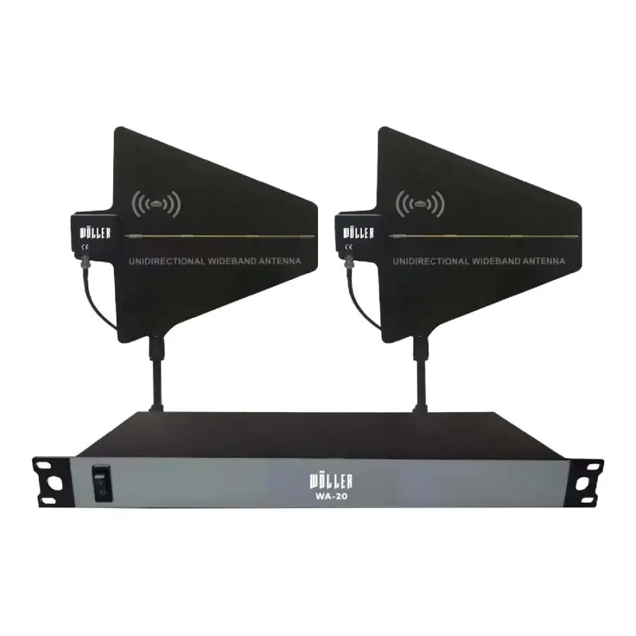 Wöller WA-20 Kablosuz Mikrofon Mesafe Yükseltici Anten Seti, sahne, konferans, etkinlik ve profesyonel ses uygulamalarında kablosuz mikrofon performansını optimize etmek için tasarlanmış güçlü bir anten çözümdür. 500-590 MHz frekans aralığında çalışan yapısı ve 6 dB kazancı sayesinde daha geniş kapsama alanı, daha stabil sinyal alımı ve daha az parazit ile çalışma imkânı sunar. LP 0A anten tipi, uzun mesafeli kullanımlarda verimliliği artırırken, 50 ohm empedans değeri profesyonel kablosuz sistemlerle tam uyumluluk sağlar. Dayanıklı yapısı, BNC konnektör girişi ve kompakt boyutları ile hem sabit kurulumlara hem de mobil sistemlere uygundur.