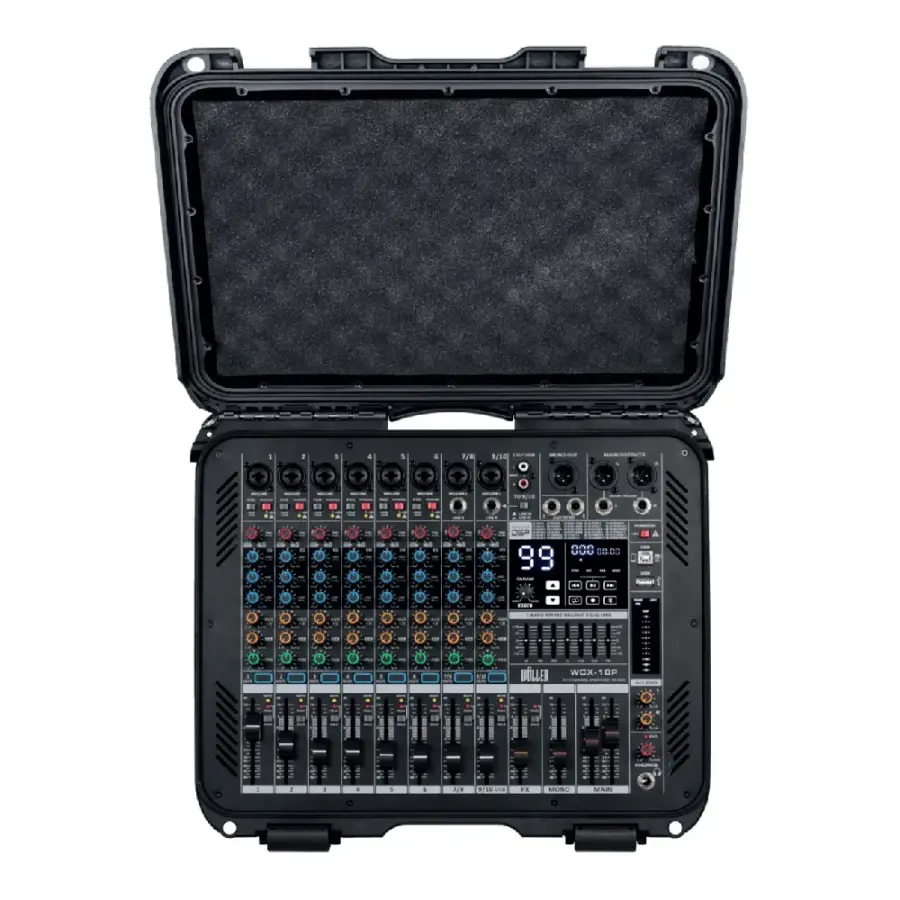 Wöller WCX-10P, taşınabilir yapısı ve dahili güçlü amplifikatörü ile sahne, etkinlik ve mobil ses sistemleri için tasarlanmış profesyonel bir power mikser modelidir. Kompakt ve korumalı kasa yapısı sayesinde hem taşımada hem de sahne kullanımında pratiklik sunar.
