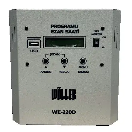 Wöller WE-220D Programlı Ezan Saati, camiler, mescitler ve ibadethaneler için tasarlanmış gelişmiş bir ezan otomasyon sistemidir. Cihaz, üç farklı ezan ve otomatik sela seçeneğiyle ibadet saatlerini en doğru şekilde yönetmenize olanak tanır. Her ezan için ses seviyesi ayrı ayrı ayarlanabilir, böylece çevre koşullarına göre en uygun ses seviyesini seçebilirsiniz. Manuel kontrol imkânı sayesinde ezan veya sela dilediğiniz an elle başlatılabilir. PC bağlantı desteği ile yazılım güncellemeleri yapılabilir, böylece cihaz her zaman güncel kalır. 3W dahili monitör hoparlör, net ve temiz bir ses çıkışı sunar.