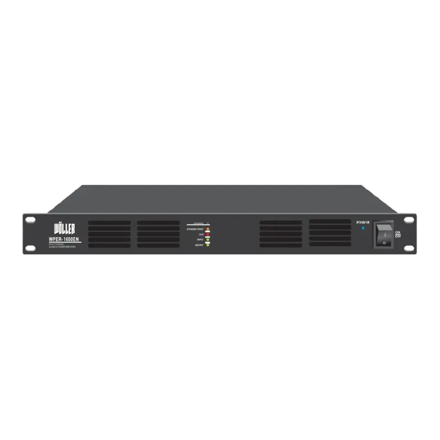 482x420x44 mm kasa ölçüleri ve 5.5 kg ağırlığı ile sağlam ve kompakt bir tasarıma sahip olan Wöller WPER-1600EN; 220V AC güç kaynağıyla çalışarak profesyonel EN54 anons projelerinde güvenilir, uzun ömürlü ve yüksek güçlü bir amplifikasyon çözümü sunar.