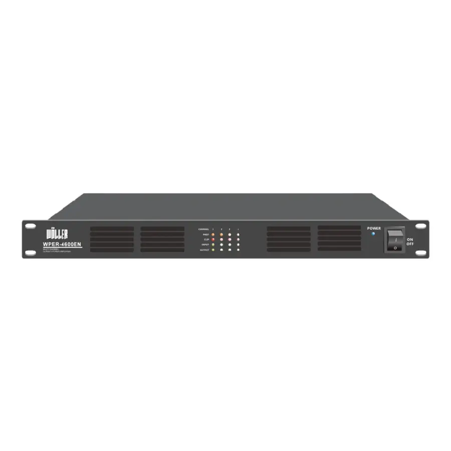 Wöller WPER-4600EN, geniş ölçekli acil durum anons sistemleri ve profesyonel güvenlik seslendirme uygulamaları için tasarlanmış, EN54-16 sertifikalı yüksek güvenilirliğe sahip bir 4 kanal power amplifikatördür. Her bir kanalda 150 Watt olmak üzere toplam 4x150W çıkış gücü sunarak çok bölgeli sistemlerde güçlü, kararlı ve esnek performans sağlar.
