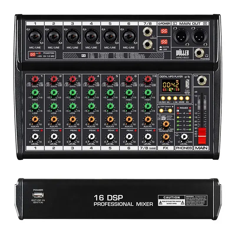Wöller WRD-800 8 Kanallı Deck Mikser, kompakt boyutu ve güçlü özellikleriyle sahne performansları, canlı yayınlar ve ev stüdyoları için ideal bir profesyonel ses mikseridir. 6 adet mono ve 1 adet stereo girişe sahip bu model, çoklu mikrofon ve enstrüman bağlantısını kolayca yönetir. Her kanalda yer alan +48V phantom güç desteği sayesinde kondansatör mikrofonlar ile kristal netliğinde ses elde edilebilir.