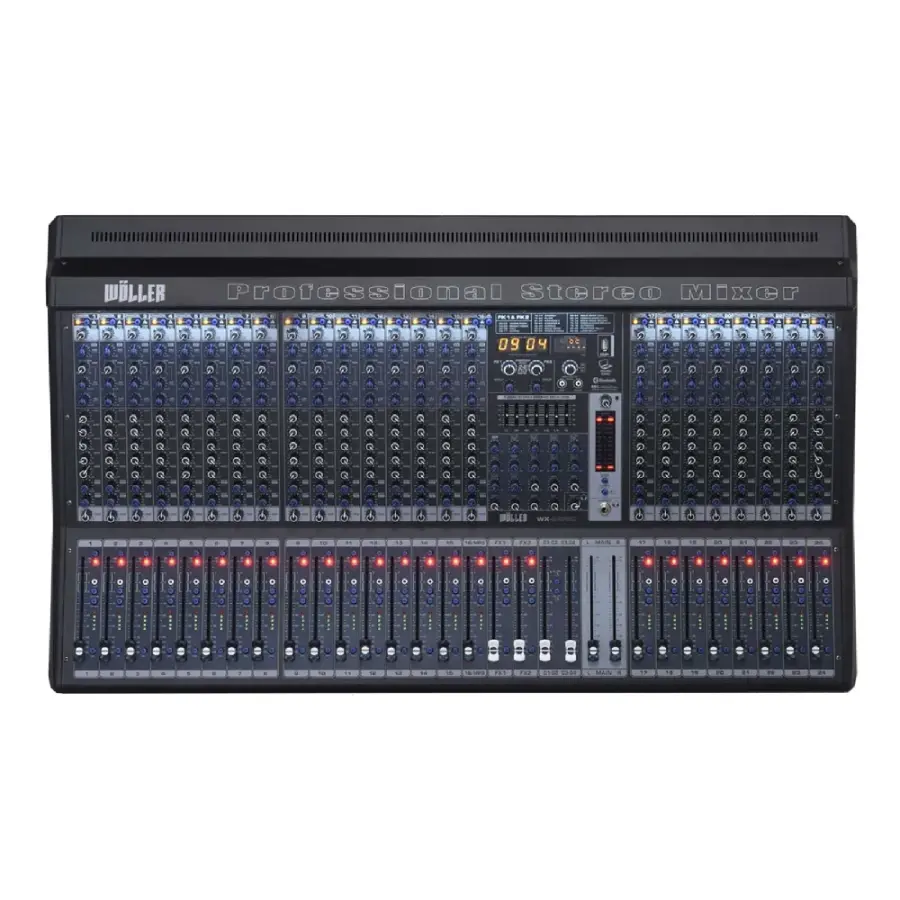 Wöller WX-24PRO 24 Kanallı Deck Mikser, profesyonel sahne performansları, büyük ölçekli canlı etkinlikler ve stüdyo kayıtları için geliştirilmiş üst düzey bir ses mikseridir. 24 adet mono girişe ve 7 adet AUX bağlantısına sahip olan bu güçlü model, çok sayıda mikrofon ve enstrüman kullanımını aynı anda destekler. Her kanalda yer alan +48V phantom güç desteği, kondansatör mikrofonlarla üstün ses kalitesi sağlar.